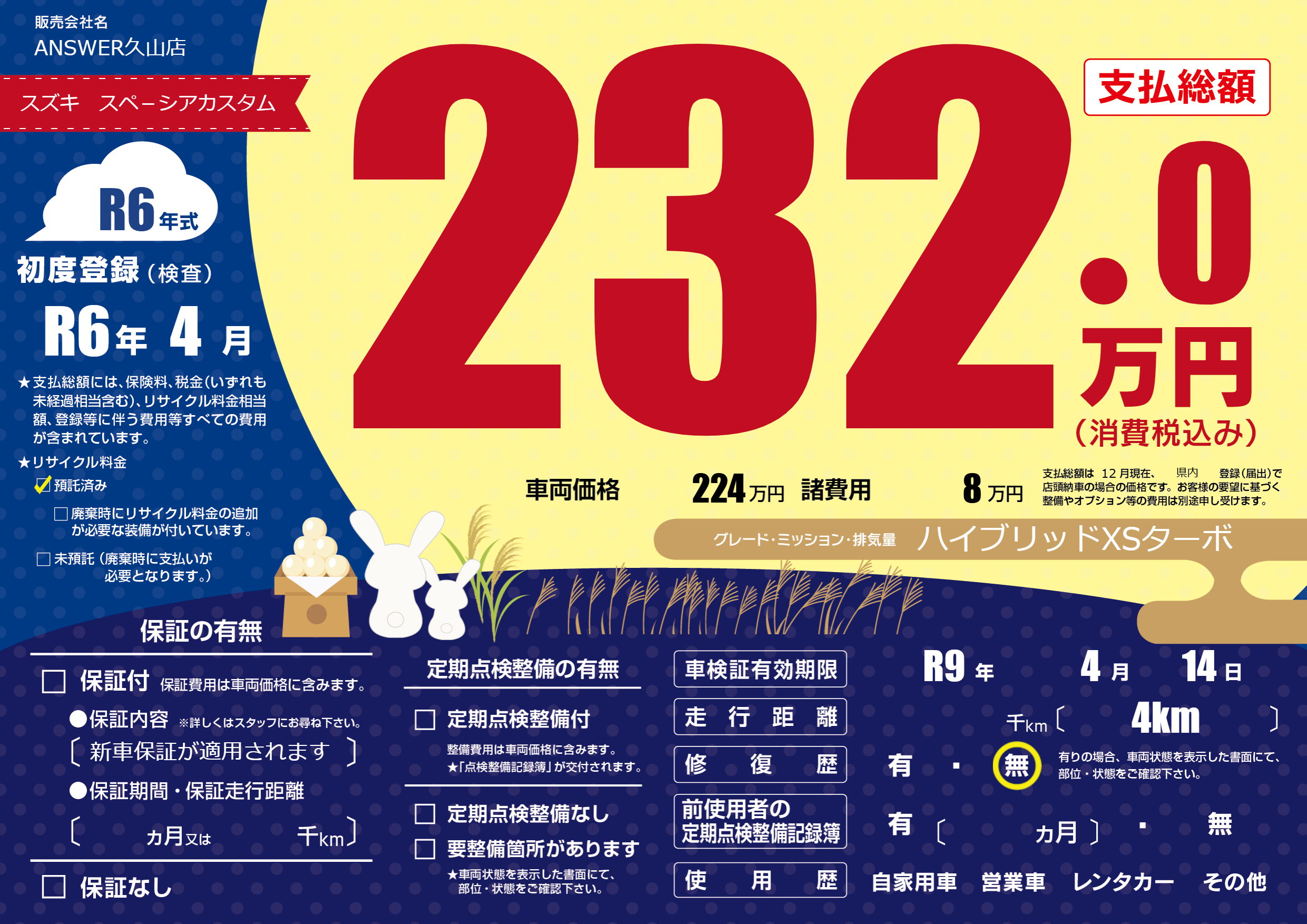 | 走行キロ | - | 初年度登録 | R6年4月 |