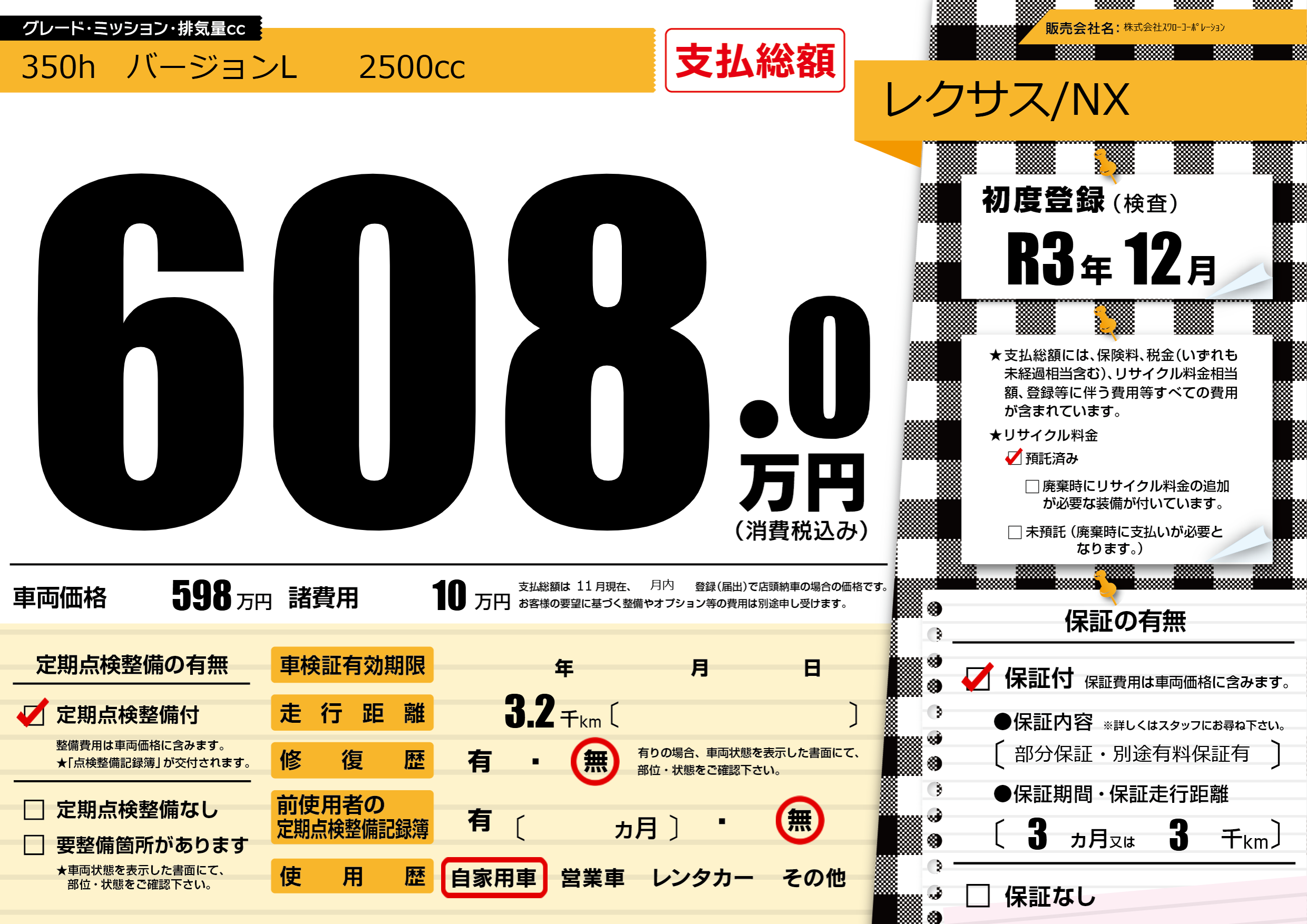 | 車名 | レクサス/NX | グレード ミッション 排気量 |