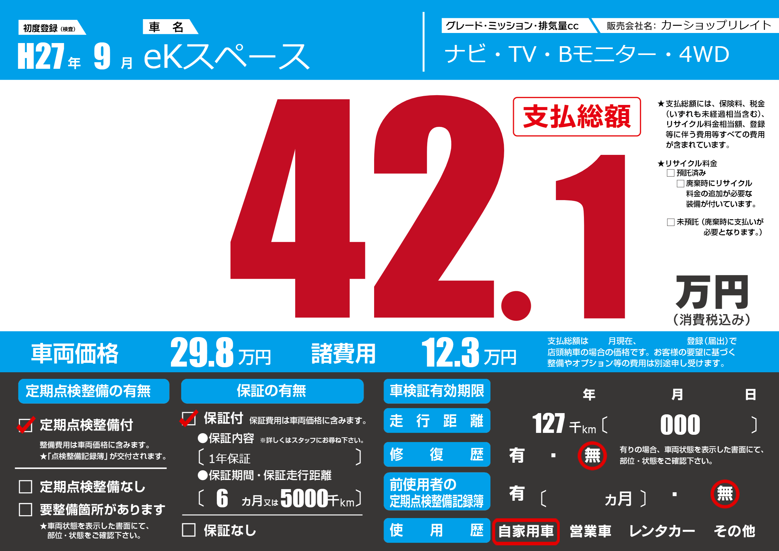 | 走行キロ | 12.7万km | 初年度登録 | H27年9月 |