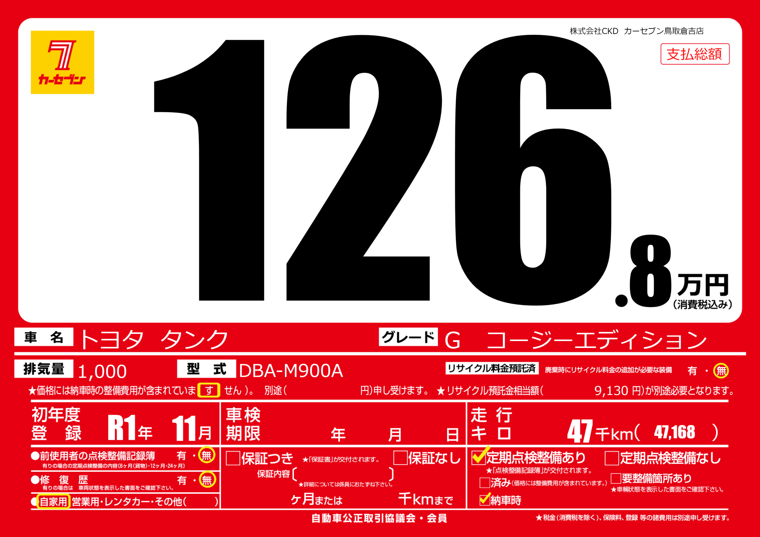 | 車名 | トヨタ タンク | グレード ミッション 排気量 |