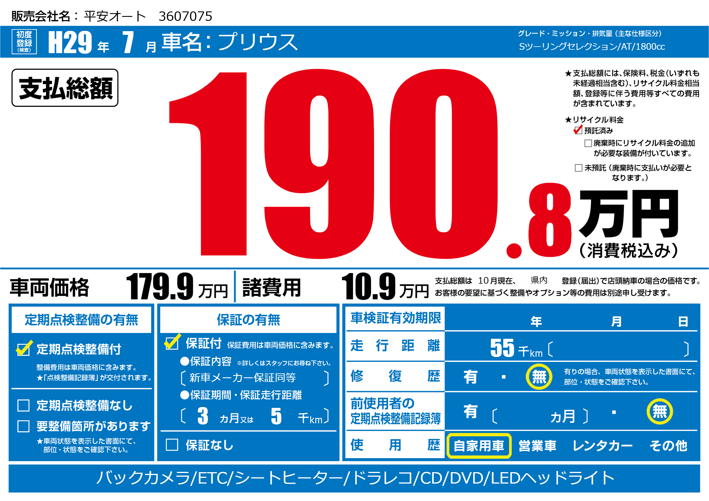 | 車名 | プリウス | グレード ミッション 排気量 |