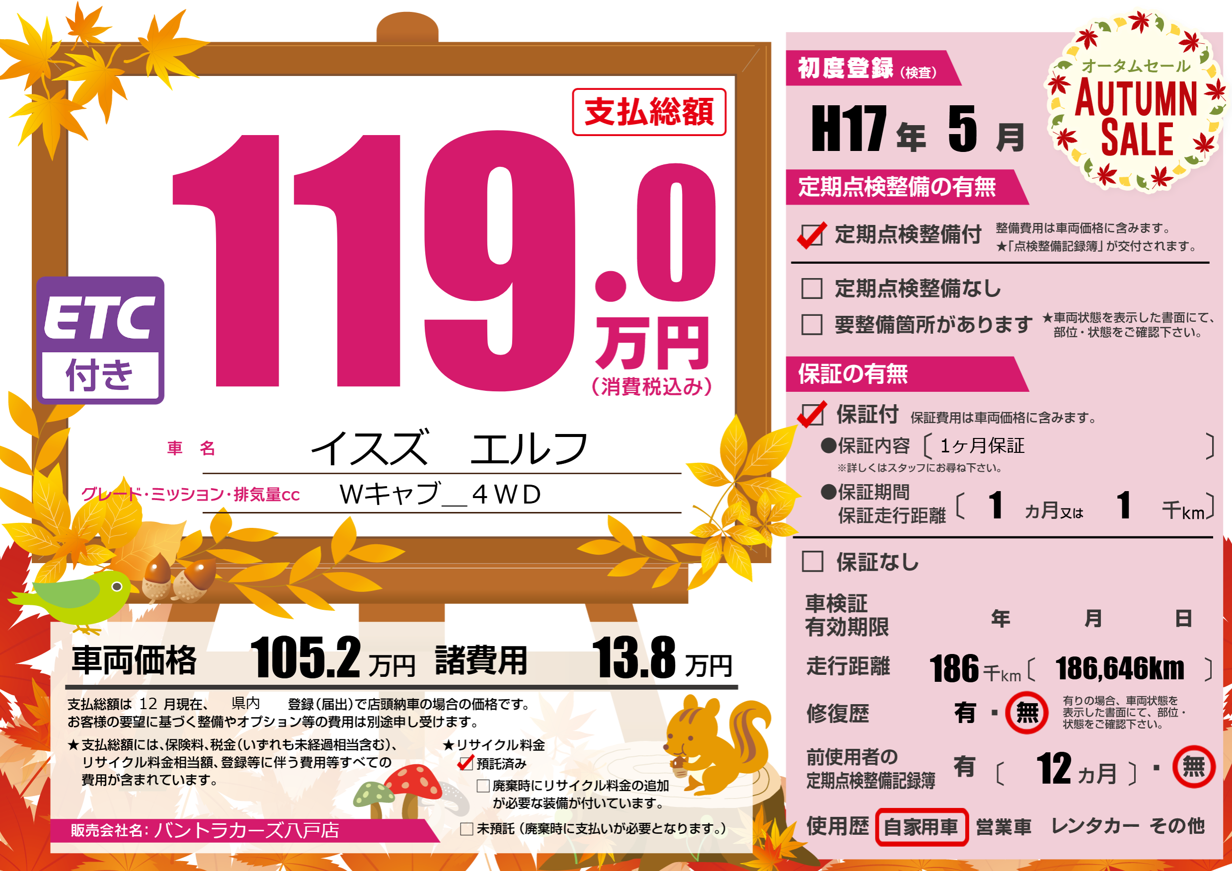 | 走行キロ | 18.6万km | 初年度登録 | H17年5月 |