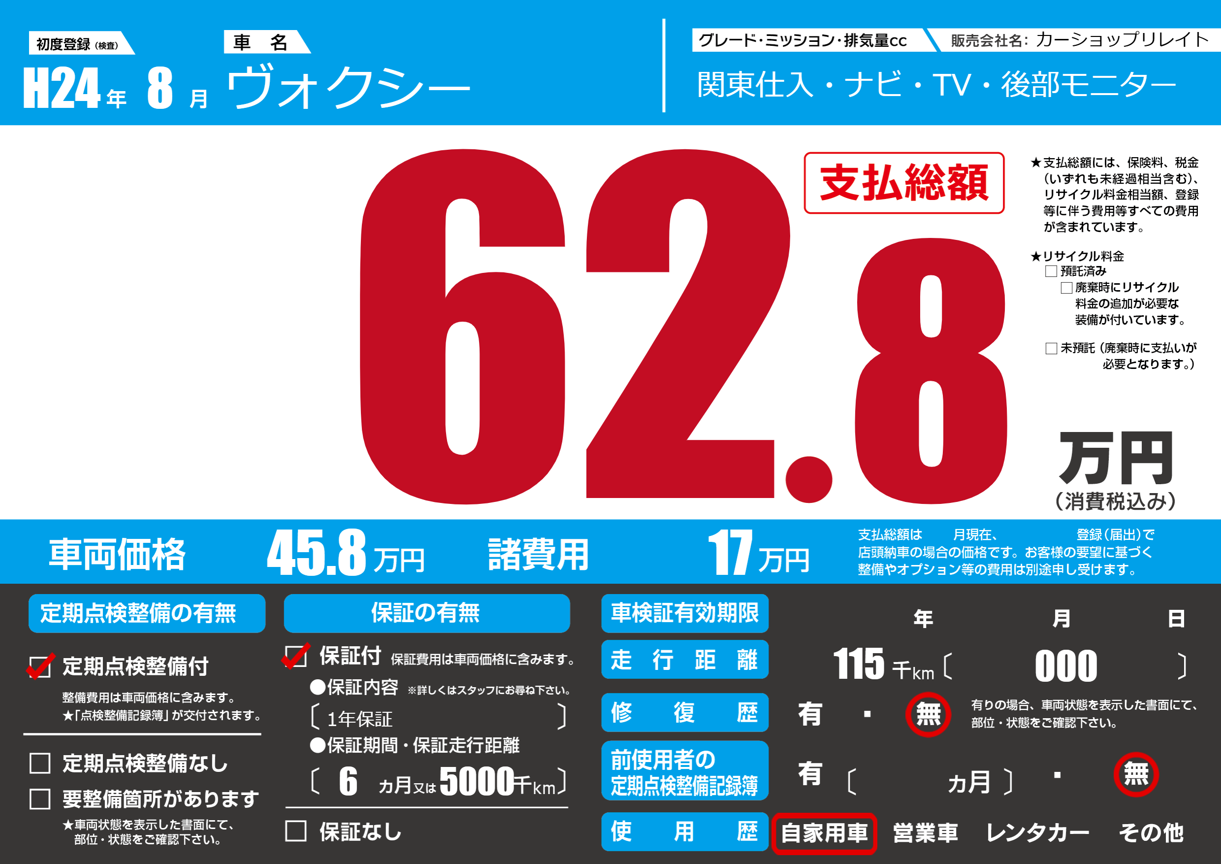 | 走行キロ | 11.5万km | 初年度登録 | H24年8月 |