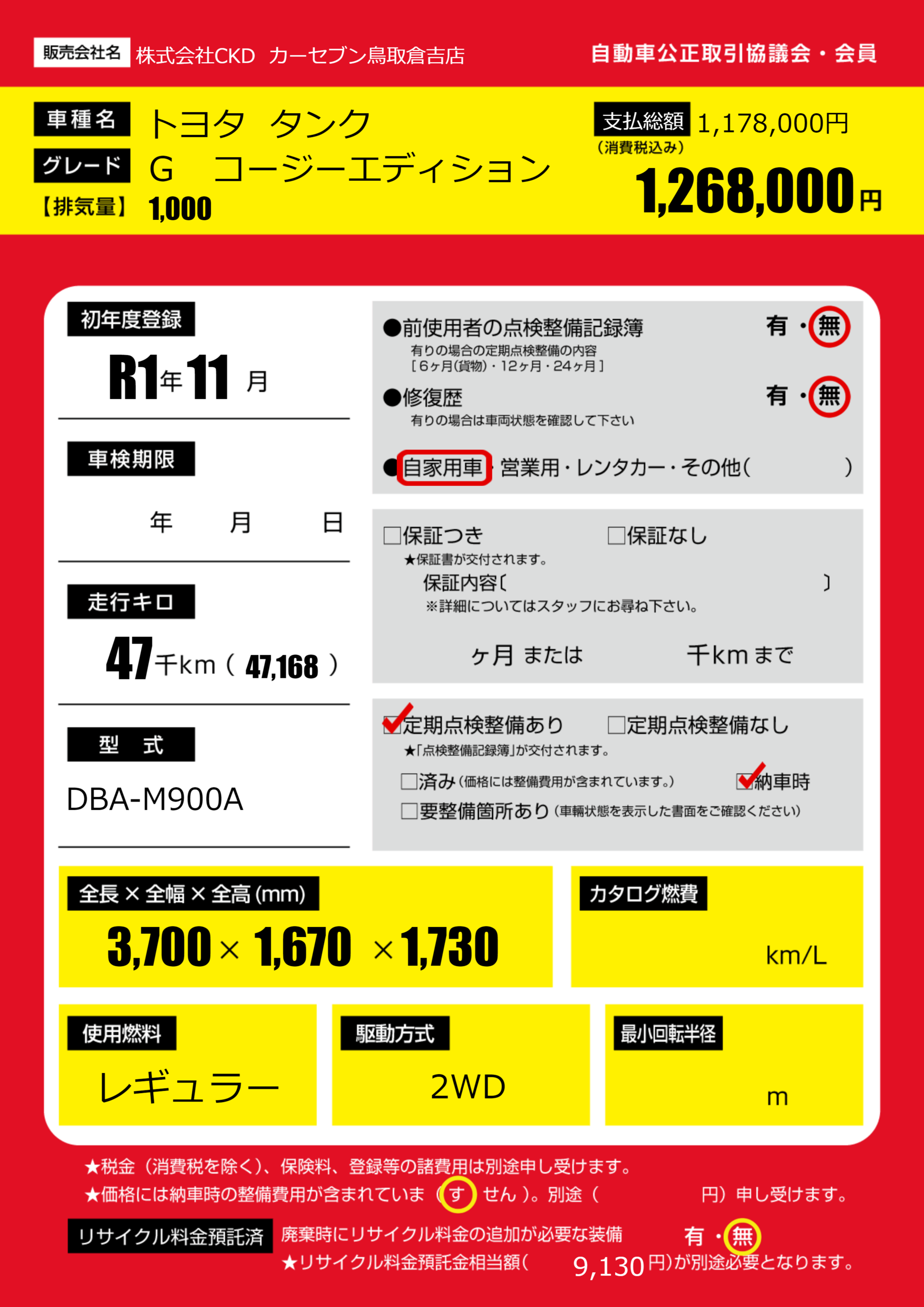 | 車名 | トヨタ タンク | グレード ミッション 排気量 |
