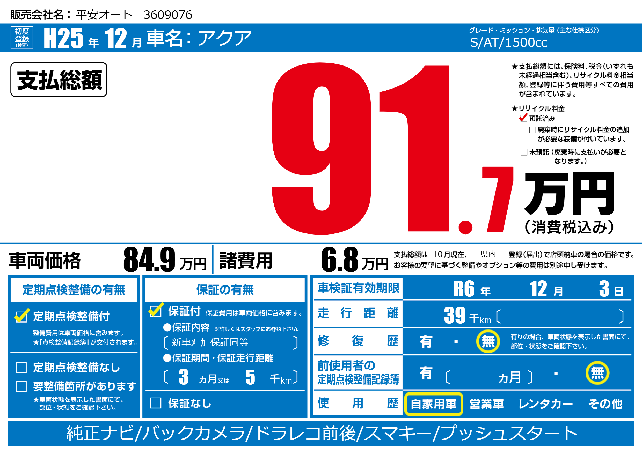 なし | 車検制限 | R6年12月3月 |