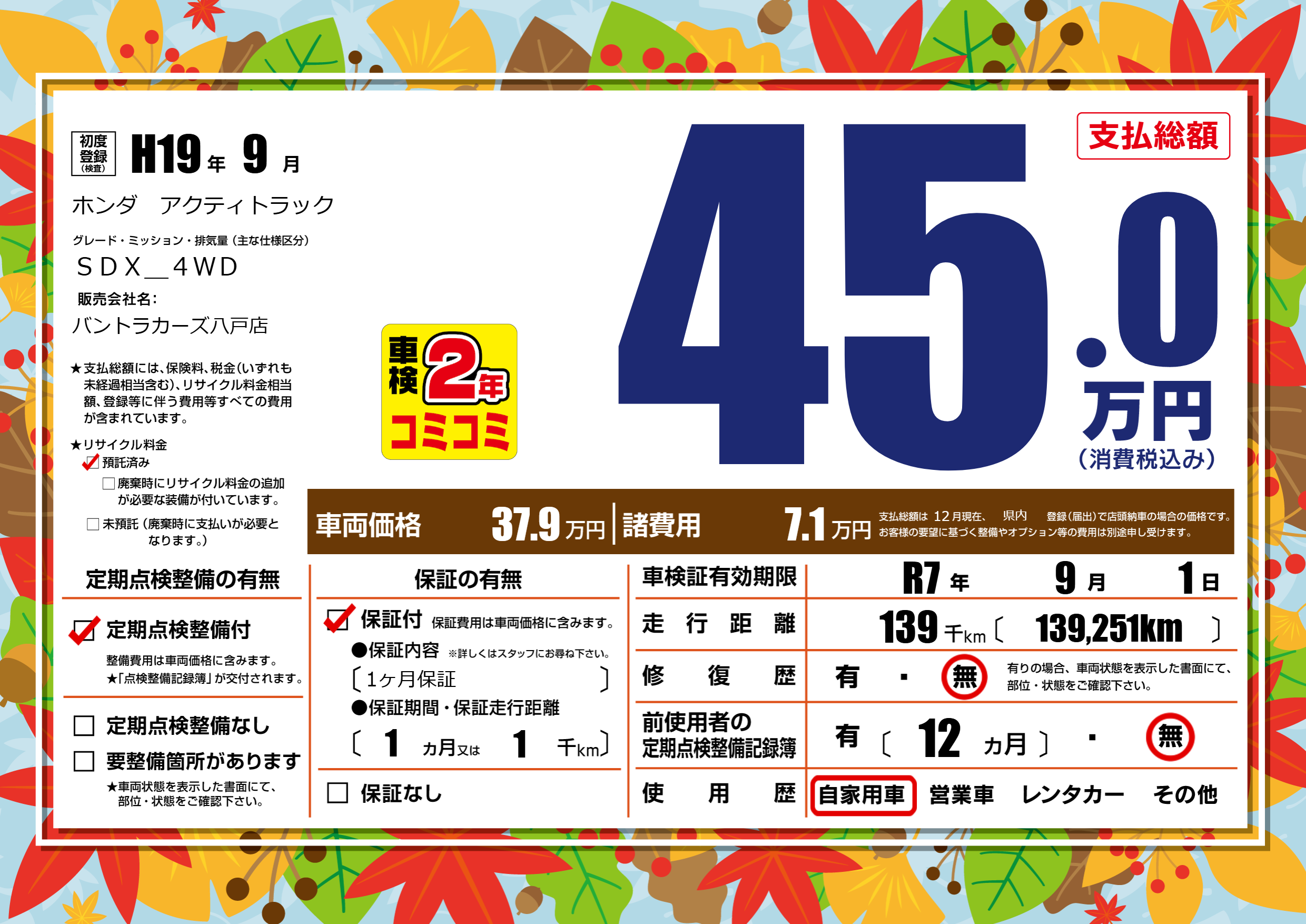 | 車名 | ホンダ アクティトラック | グレード ミッション 排気量 |