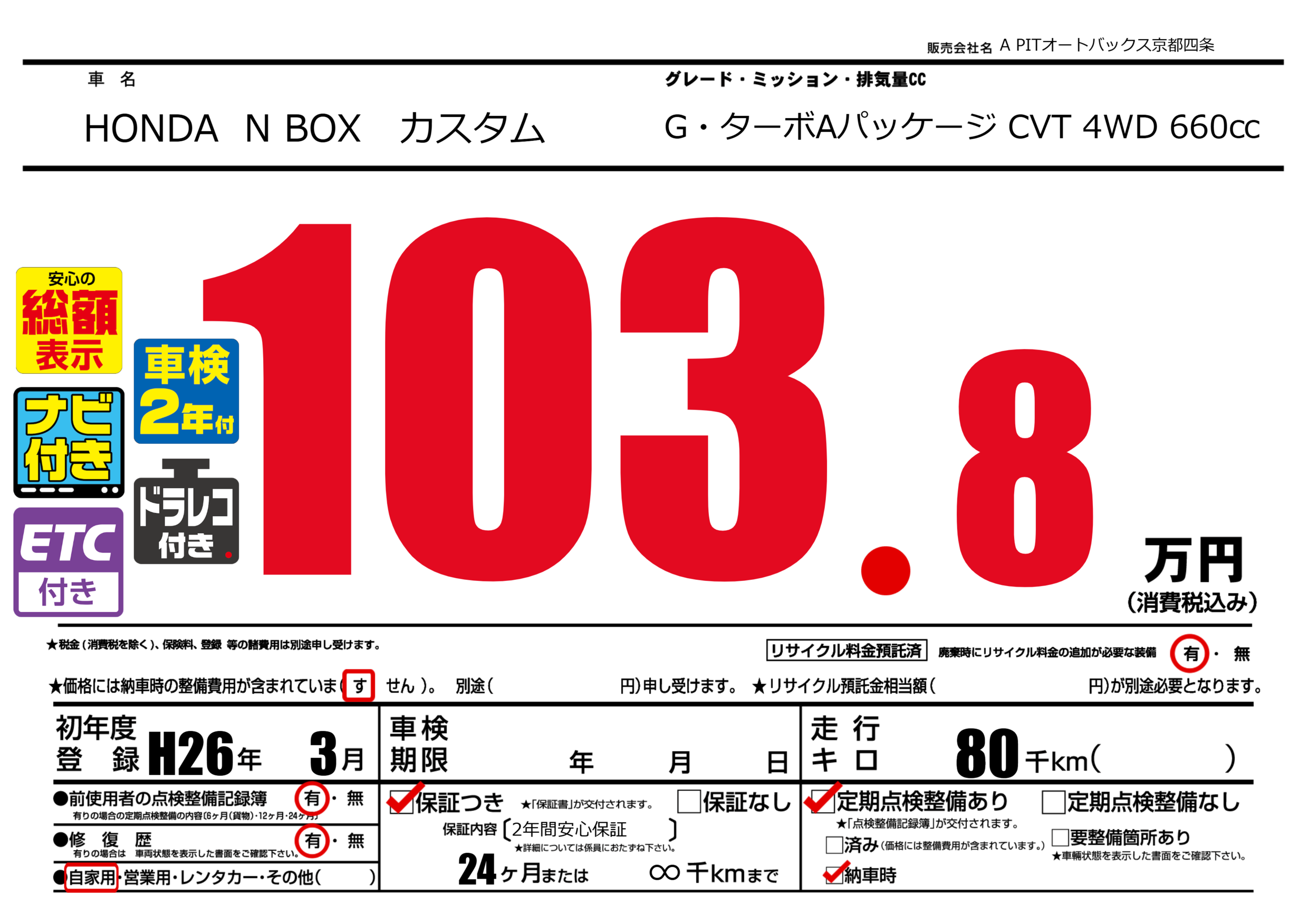 | 走行キロ | 8万km | 初年度登録 | H26年3月 |
