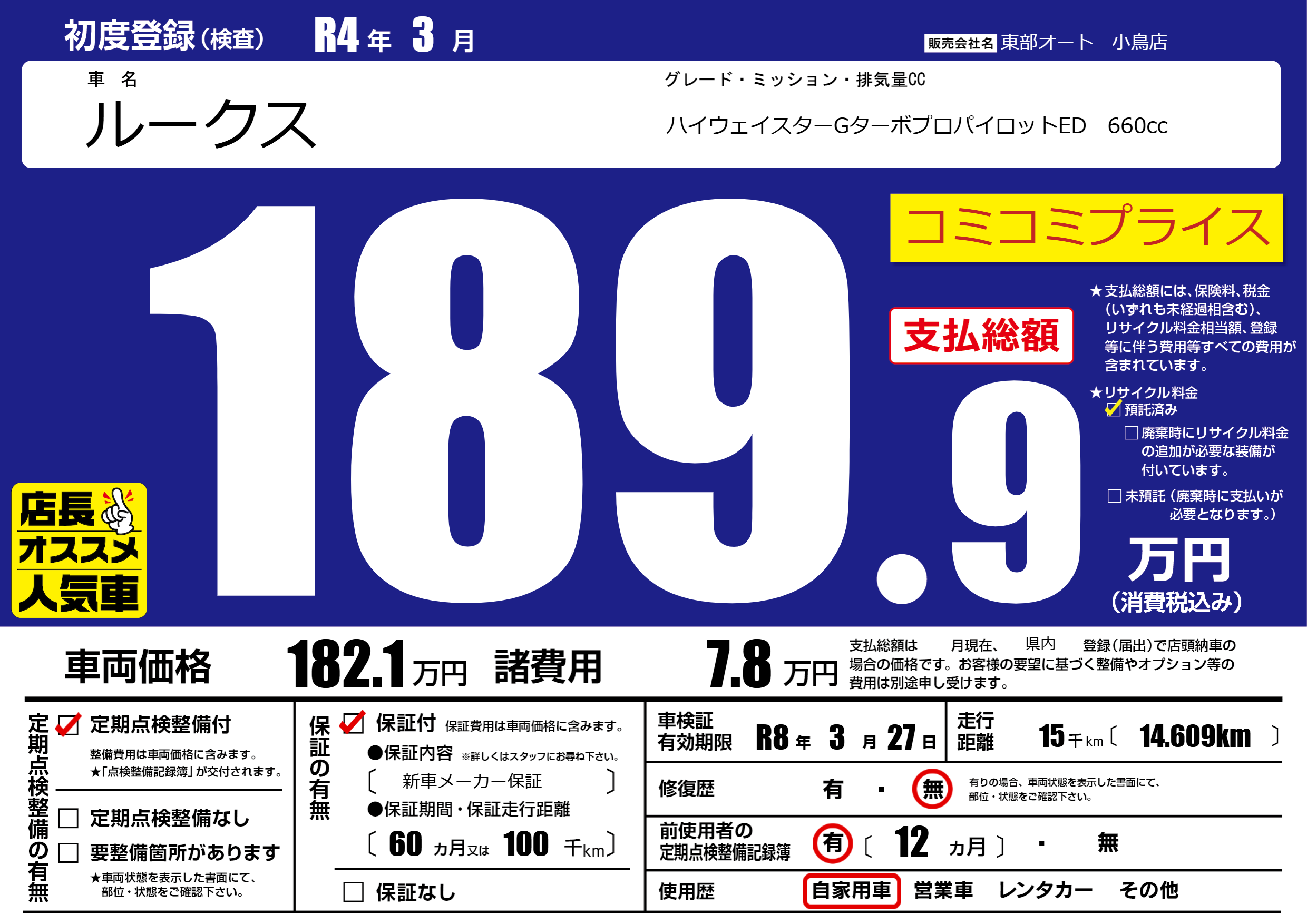 | 走行キロ | 1.5万km | 初年度登録 | R4年3月 |