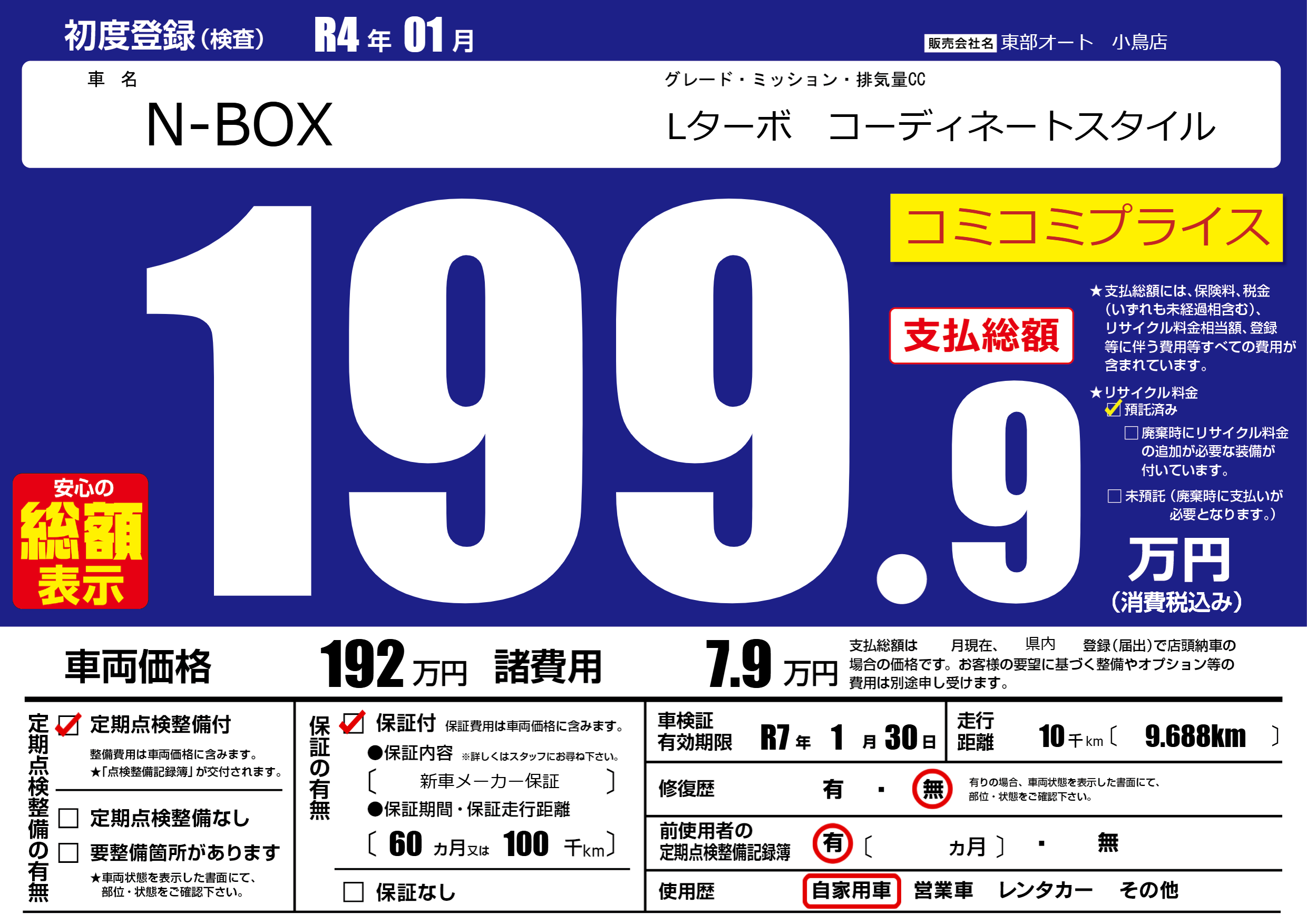 | 車名 | N-BOX | グレード ミッション 排気量 |