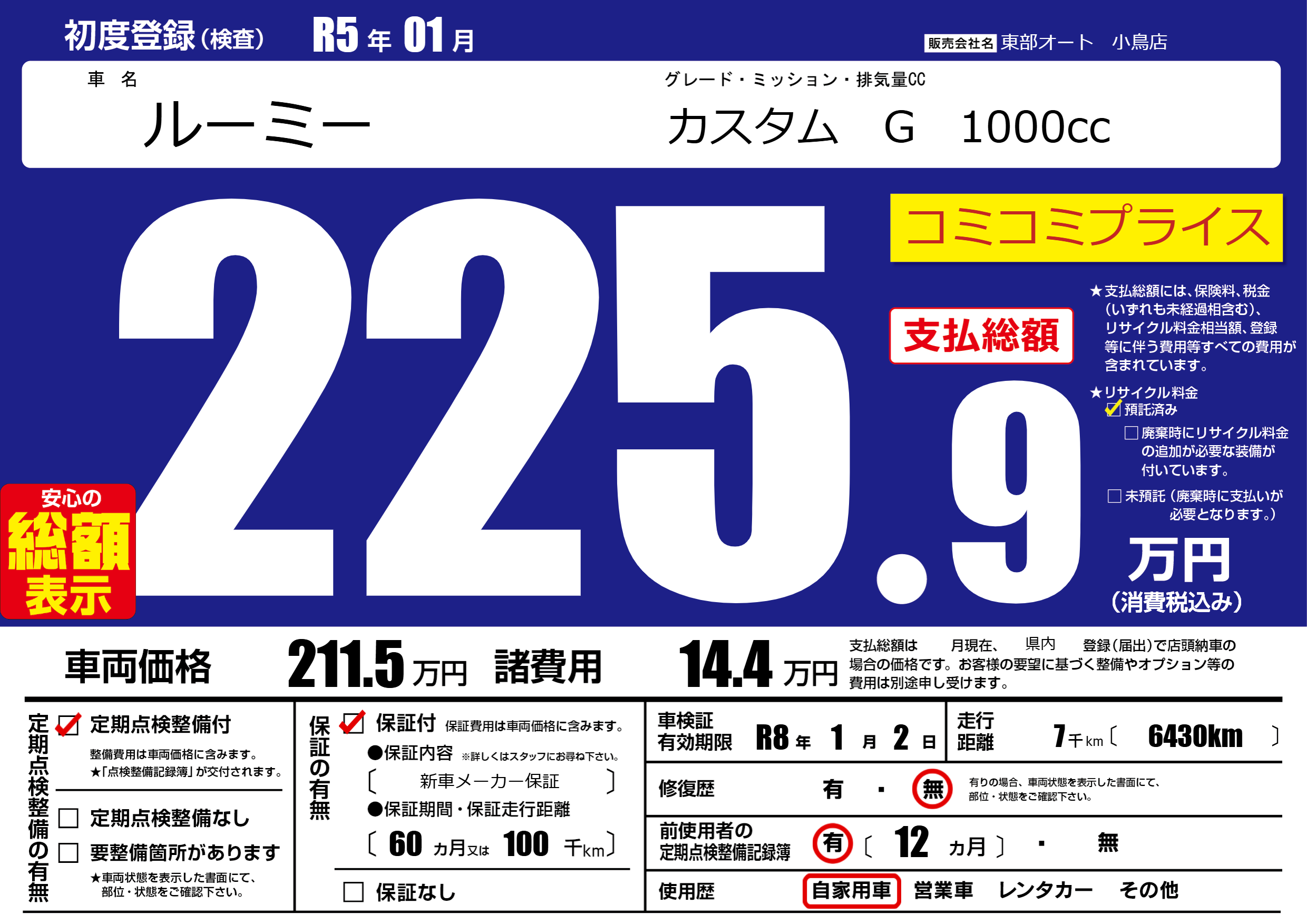 | 車名 | ルーミー | グレード ミッション 排気量 |