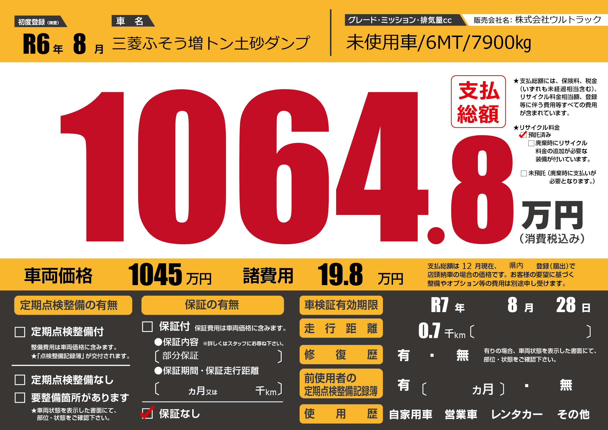 | 車名 | 三菱ふそう増トン土砂ダンプ | グレード ミッション 排気量 |