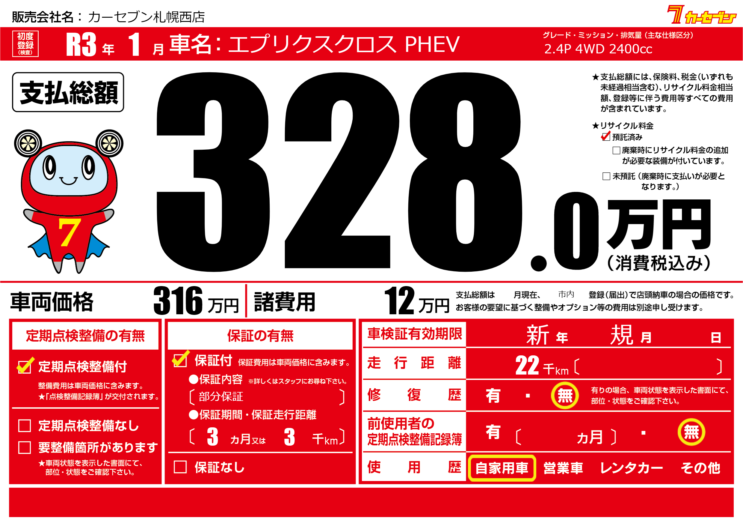 保証付き 保証内容(部分保証) 3ヶ月または(3)千kmまで |