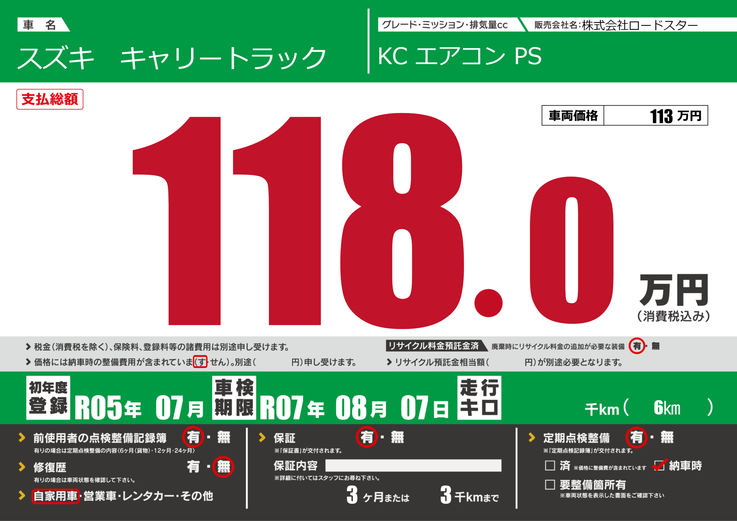 | 走行キロ | - | 初年度登録 | R05年07月 |