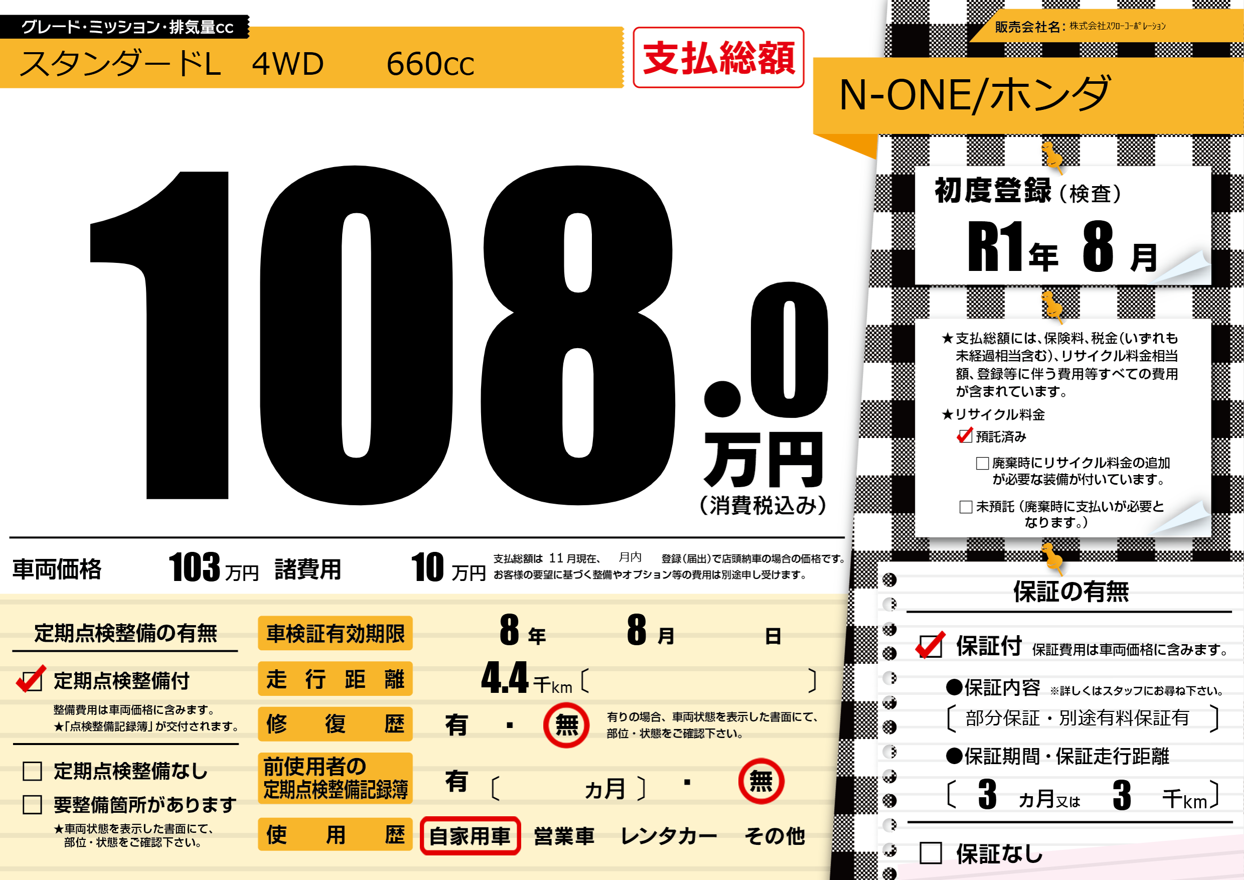 | 車名 | N-ONE/ホンダ | グレード ミッション 排気量 |