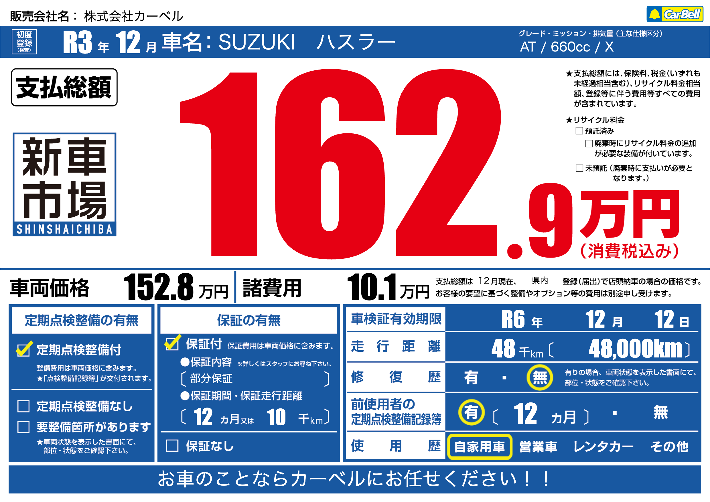 | 車名 | SUZUKI ハスラー | グレード ミッション 排気量 |