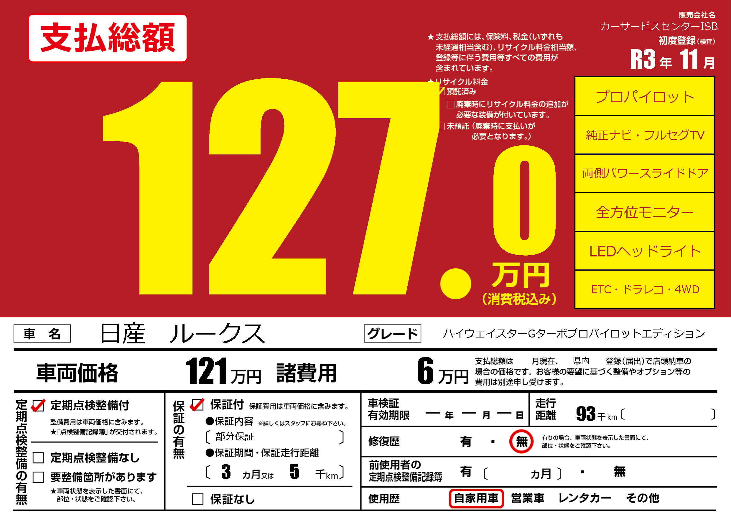 | 走行キロ | 9.3万km | 初年度登録 | R3年11月 |