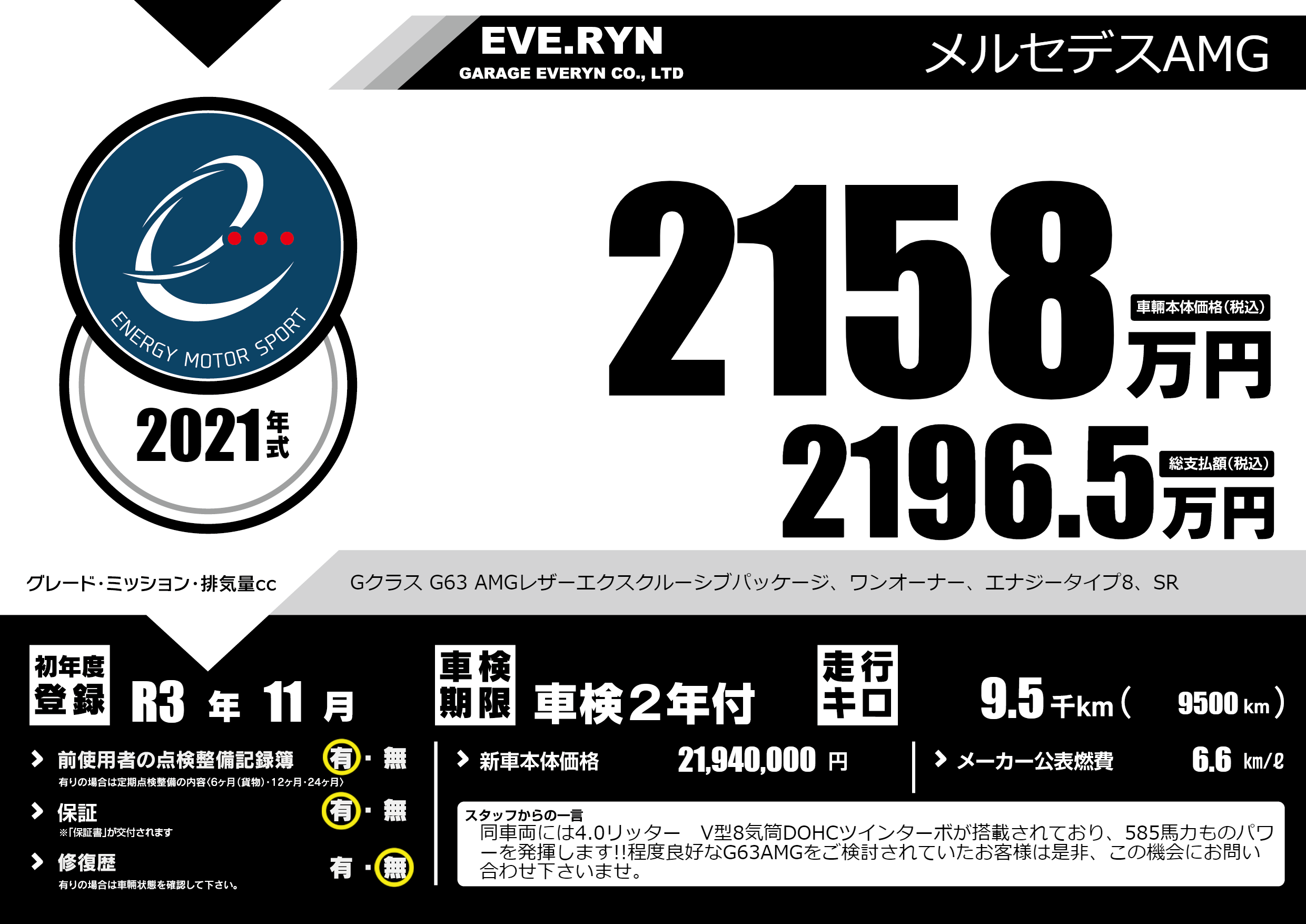 Gクラス G63 AMGレザーエクスクルーシブパッケージ、ワンオーナー、エナジータイプ8、SR |