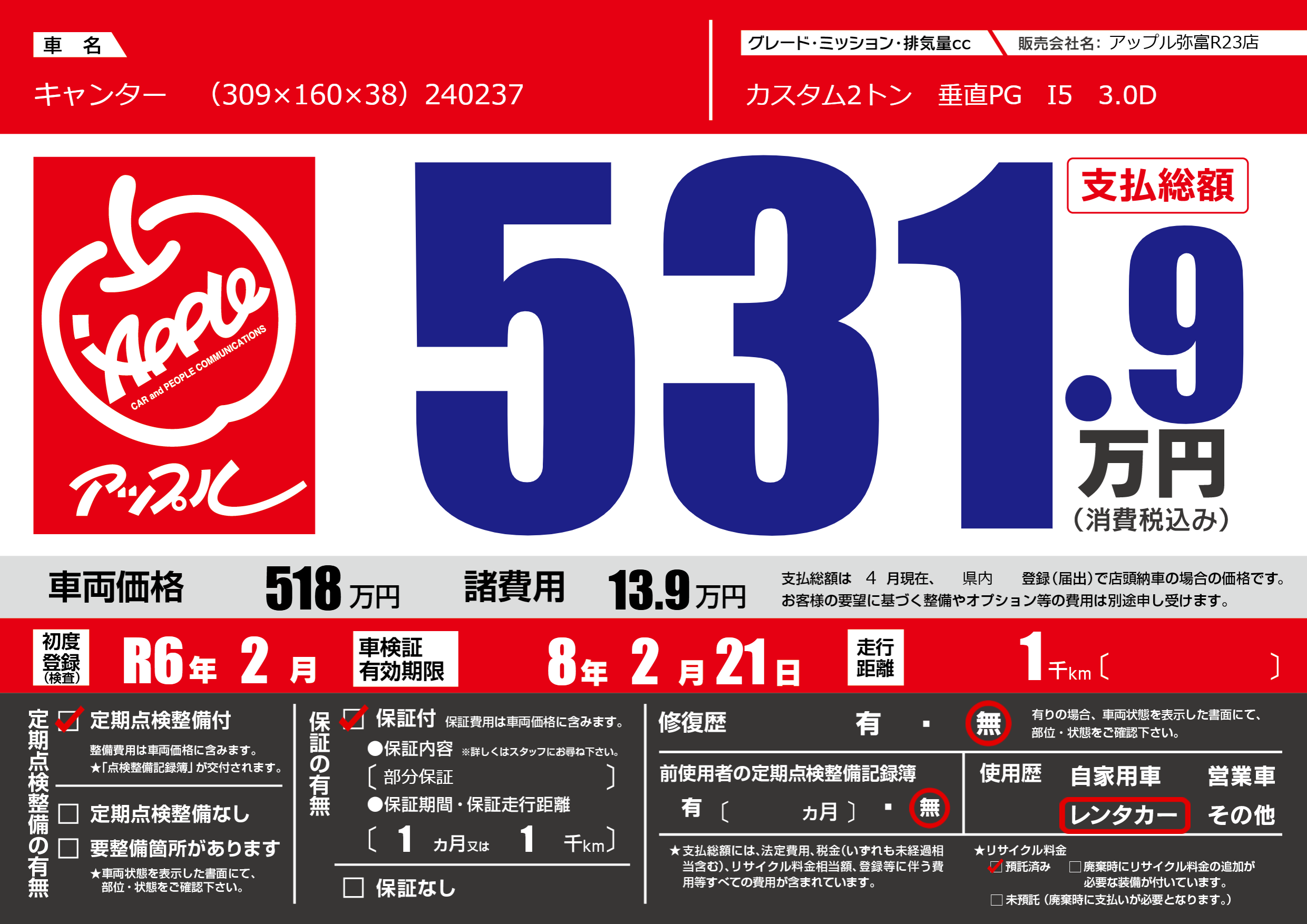 | 車名 | キャンター (309×160×38)240237 | グレード ミッション 排気量 |