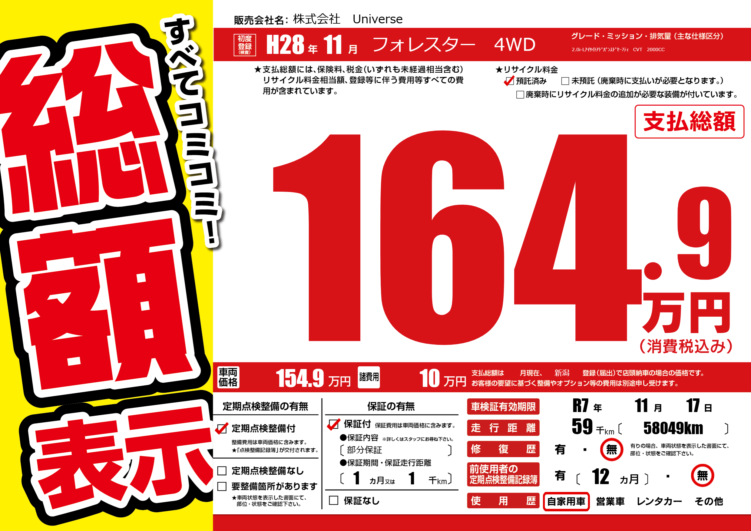 | 車名 | フォレスター 4WD | グレード ミッション 排気量 |