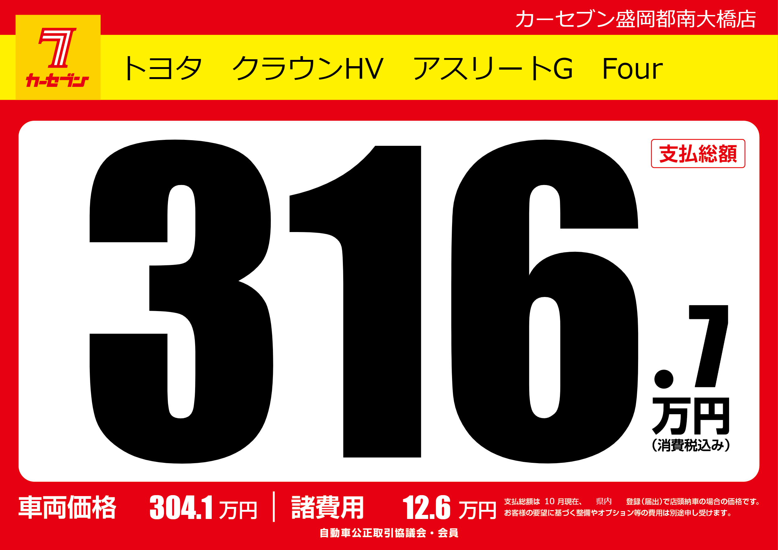 | 車名 | トヨタ クラウンHV アスリートG Four | グレード ミッション 排気量 |