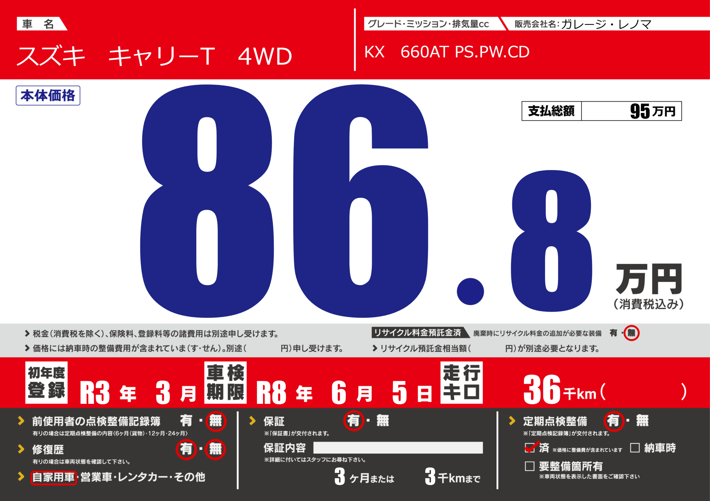 | 定期点検整備 | 定期点検整備あり 定期点検整備済み | ||