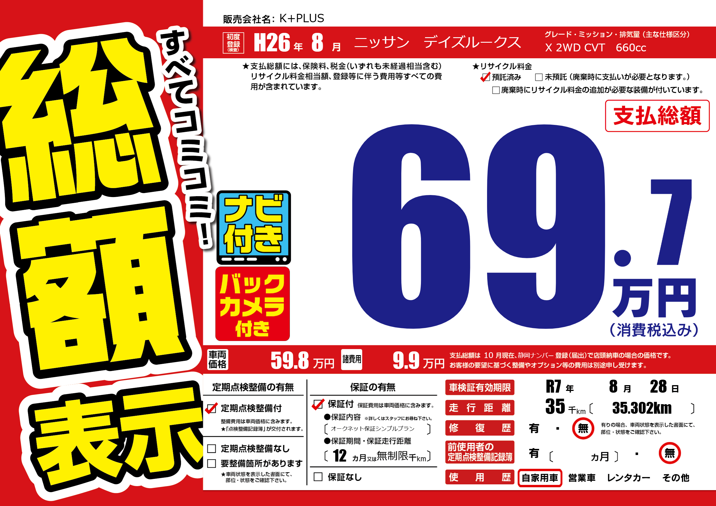 | 車名 | ニッサン デイズルークス | グレード ミッション 排気量 |