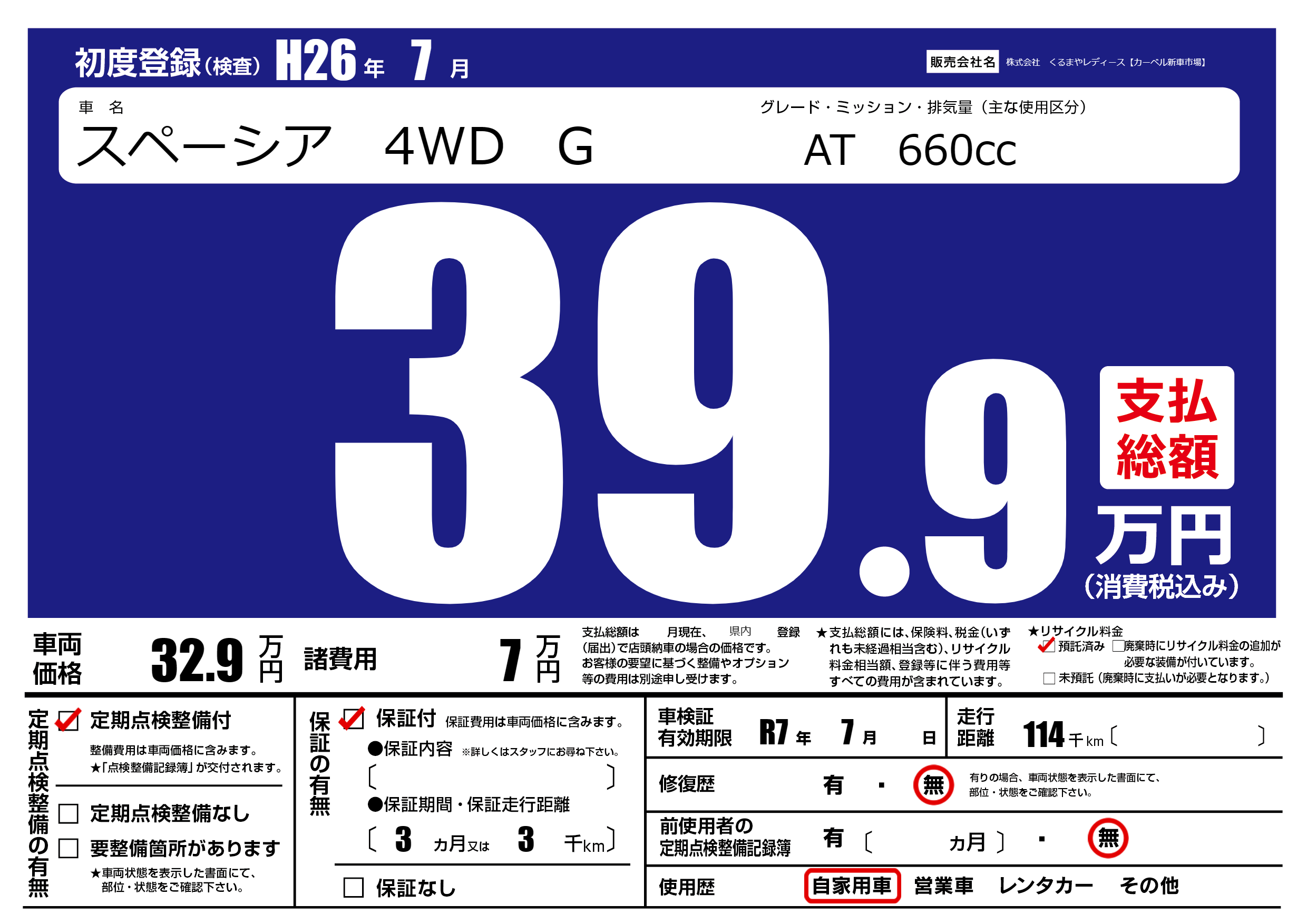 | 車名 | スペーシア 4WD G | グレード ミッション 排気量 |