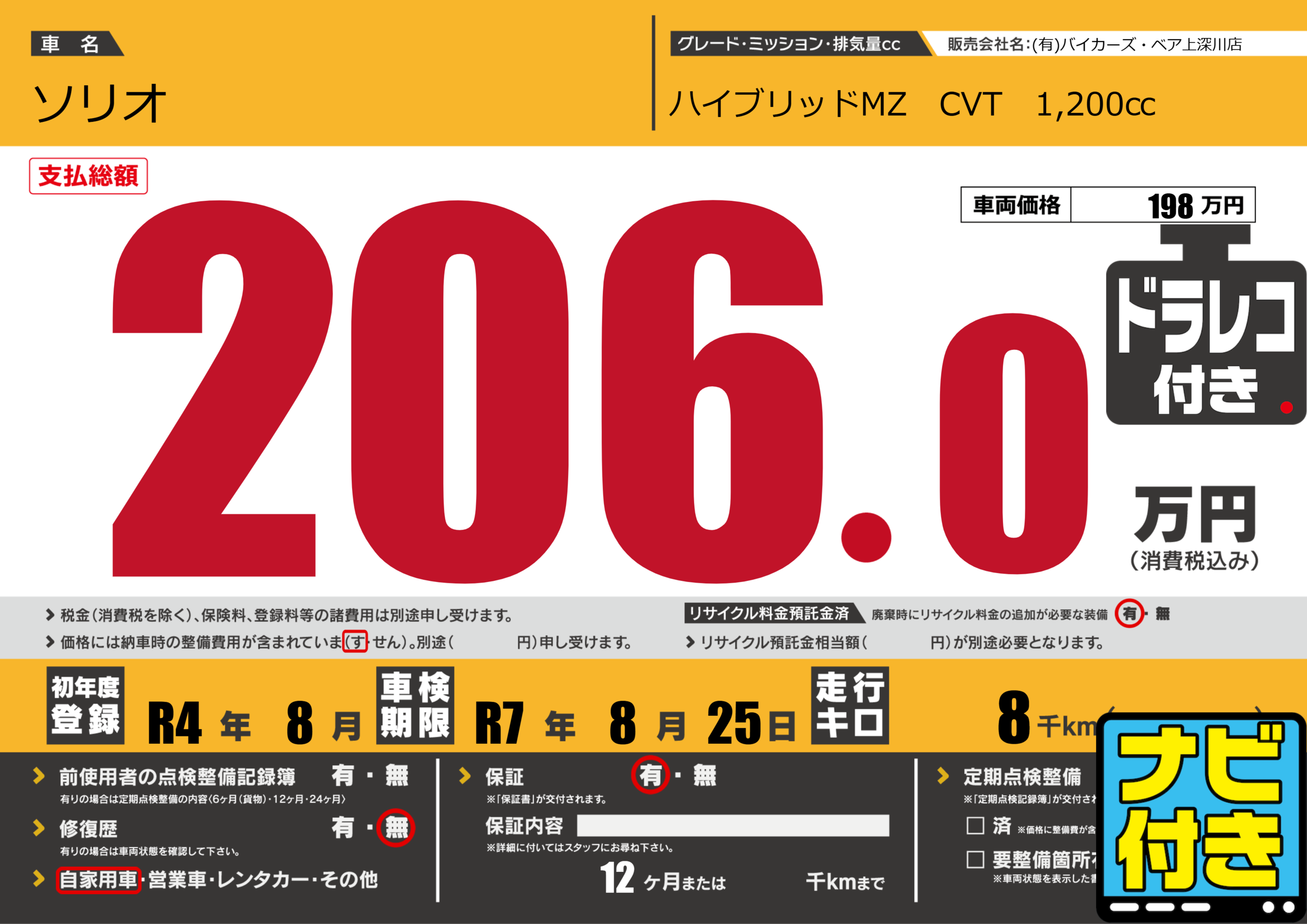 | 走行キロ | 0.8万km | 初年度登録 | R4年8月 |