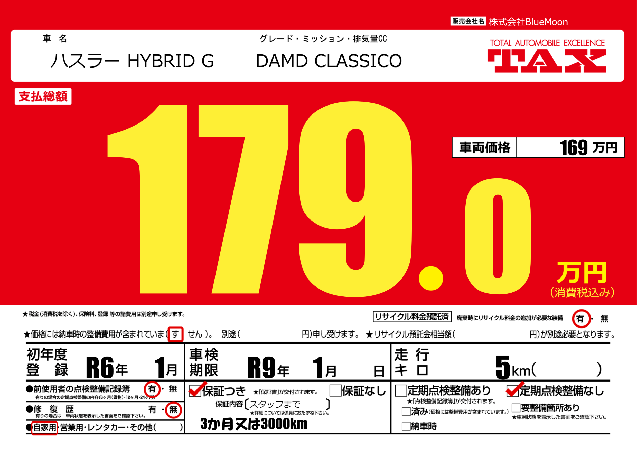 | 車名 | ハスラー HYBRID G | グレード ミッション 排気量 |