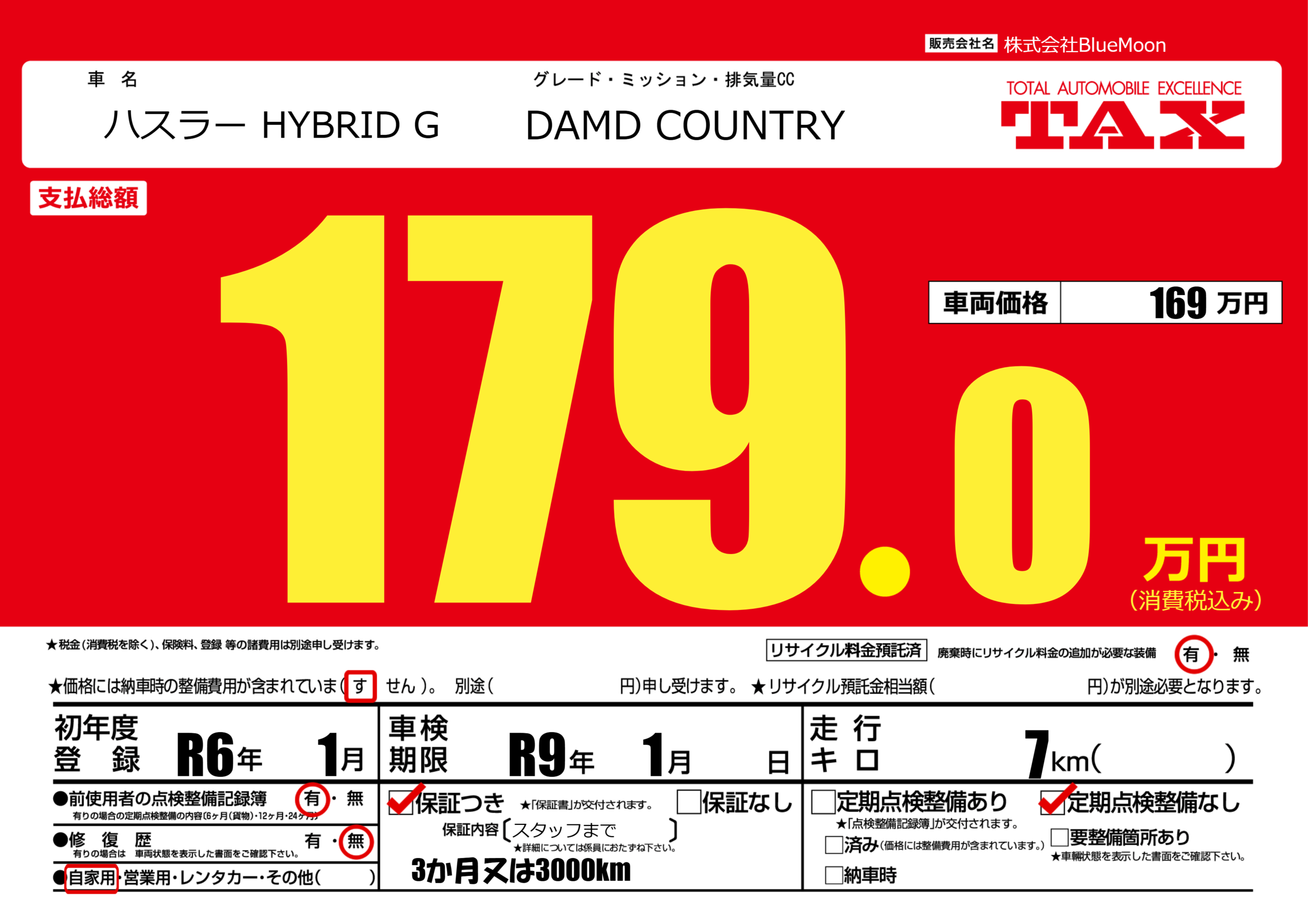 | 車名 | ハスラー HYBRID G | グレード ミッション 排気量 |