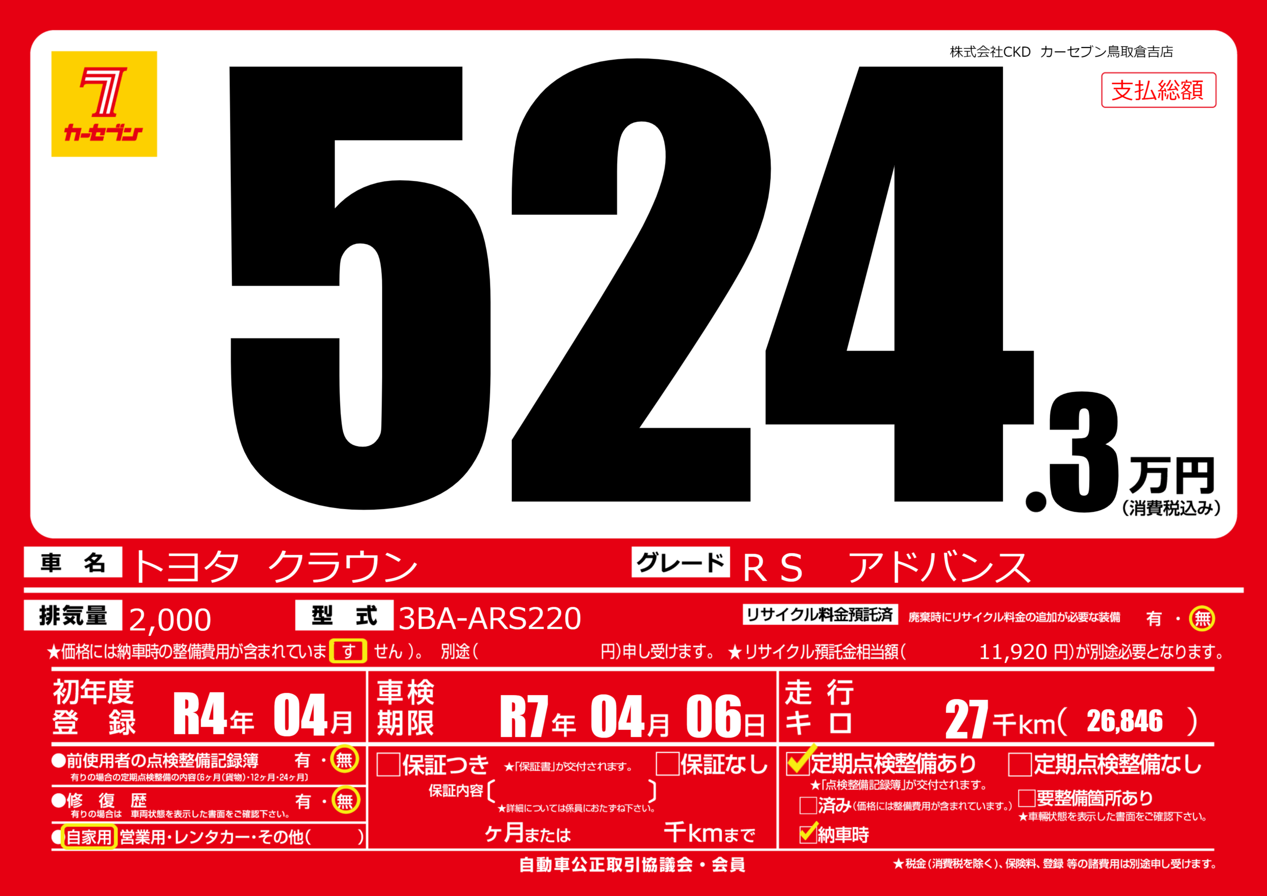 | 車名 | トヨタ クラウン | グレード ミッション 排気量 |