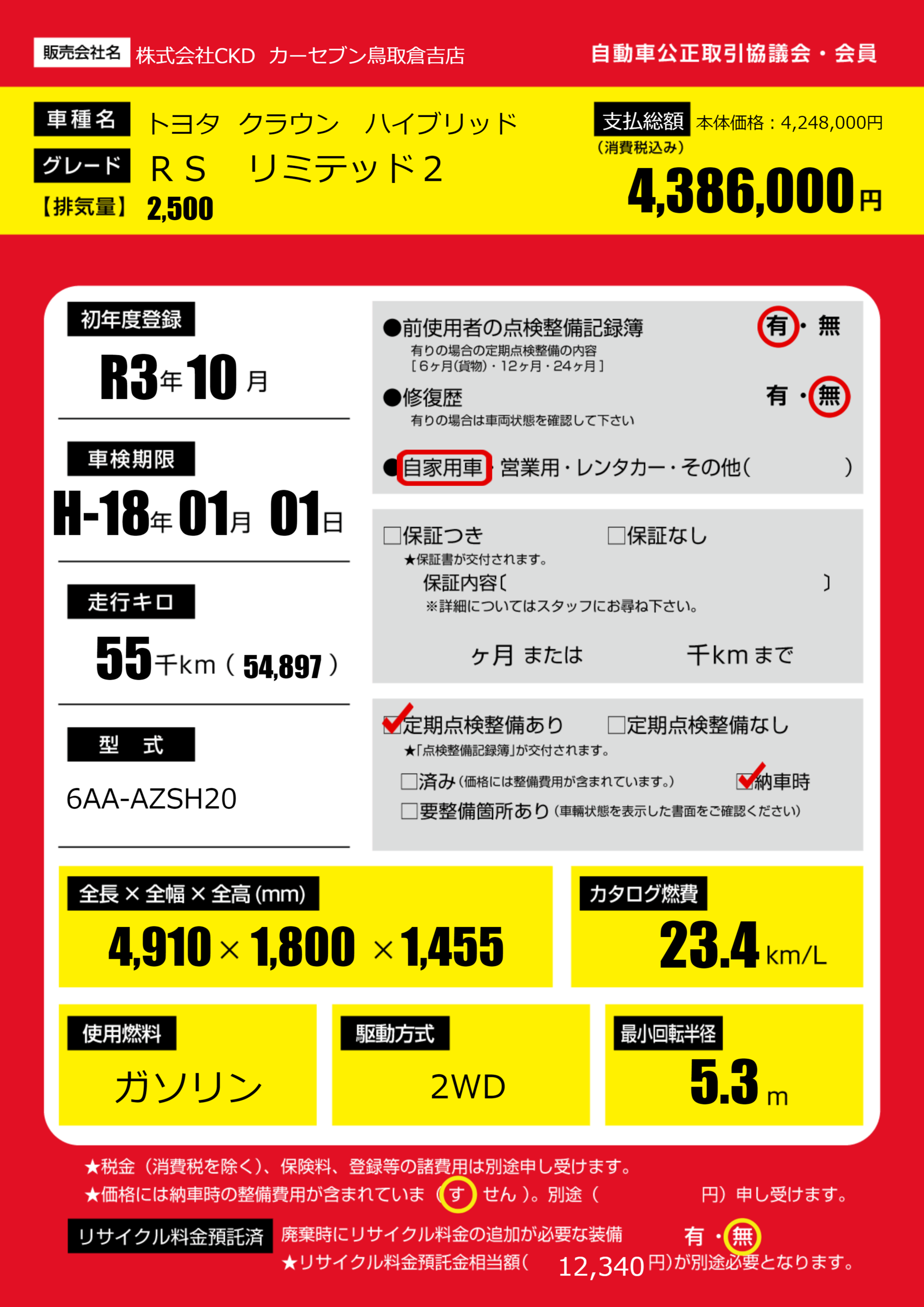 | 車名 | トヨタ クラウン ハイブリッド | グレード ミッション 排気量 |