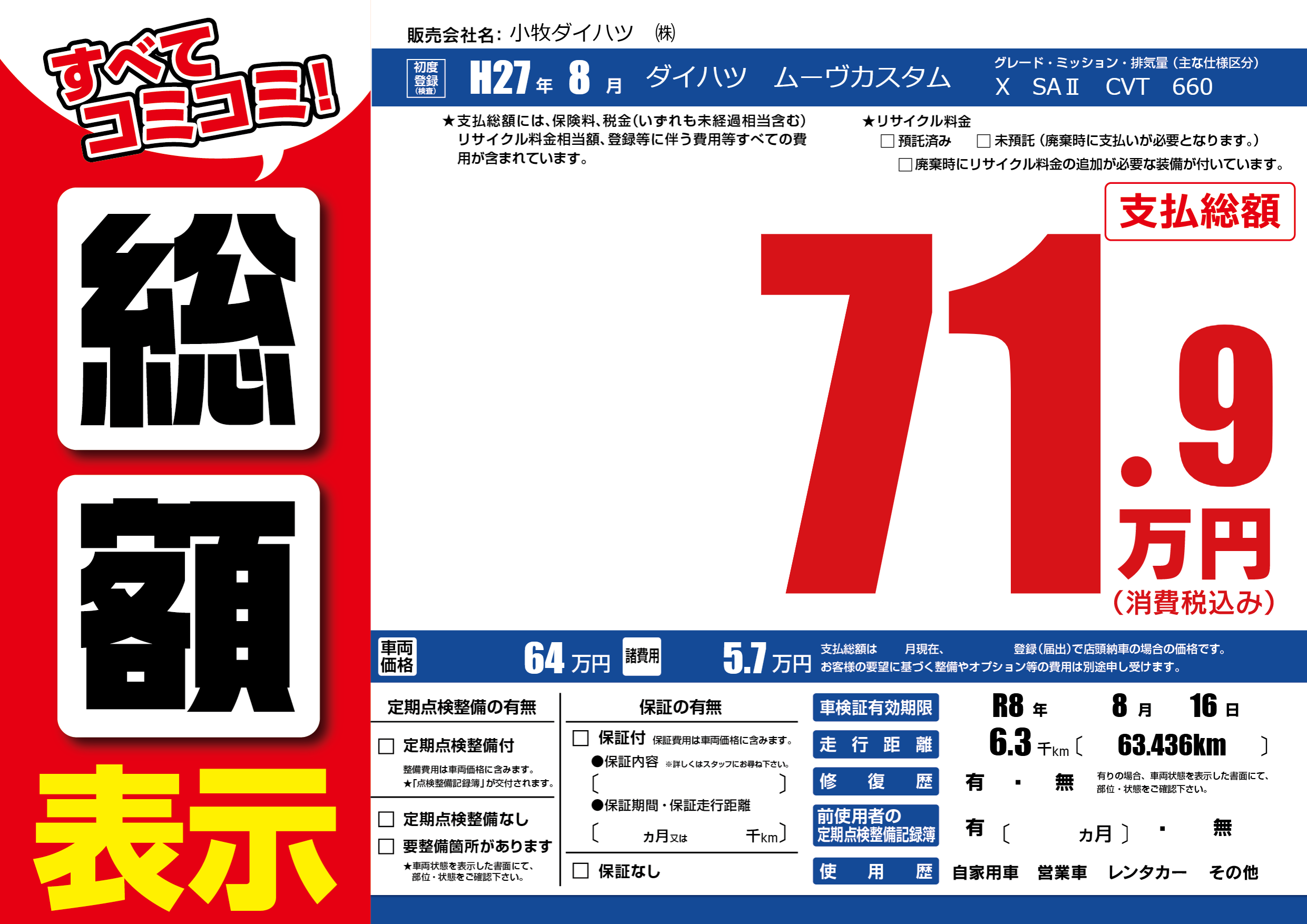 | 走行キロ | 0.6万km | 初年度登録 | H27年8月 |