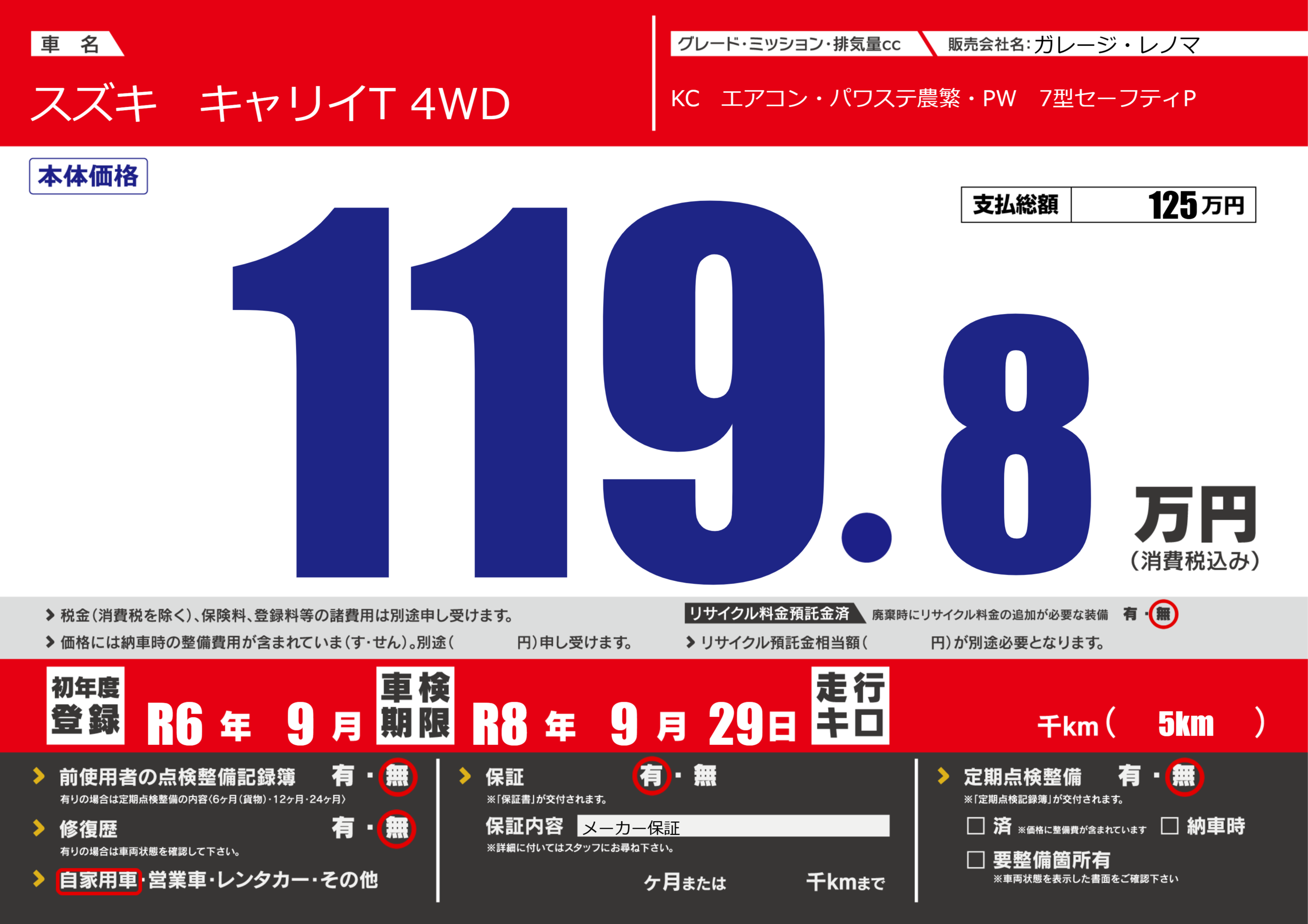 | 走行キロ | - | 初年度登録 | R6年9月 |