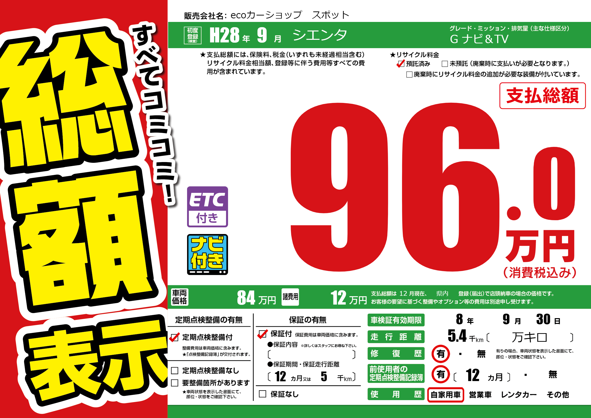 | 車名 | シエンタ | グレード ミッション 排気量 |