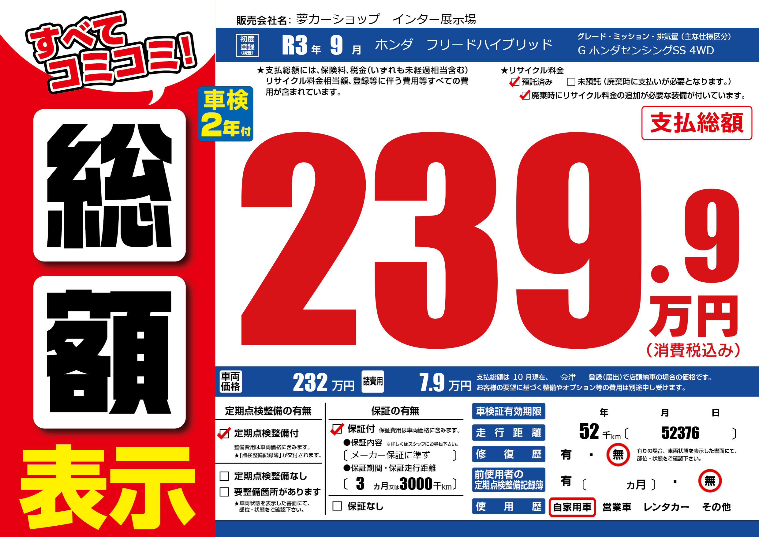 | 車名 | ホンダ フリードハイブリッド | グレード ミッション 排気量 |