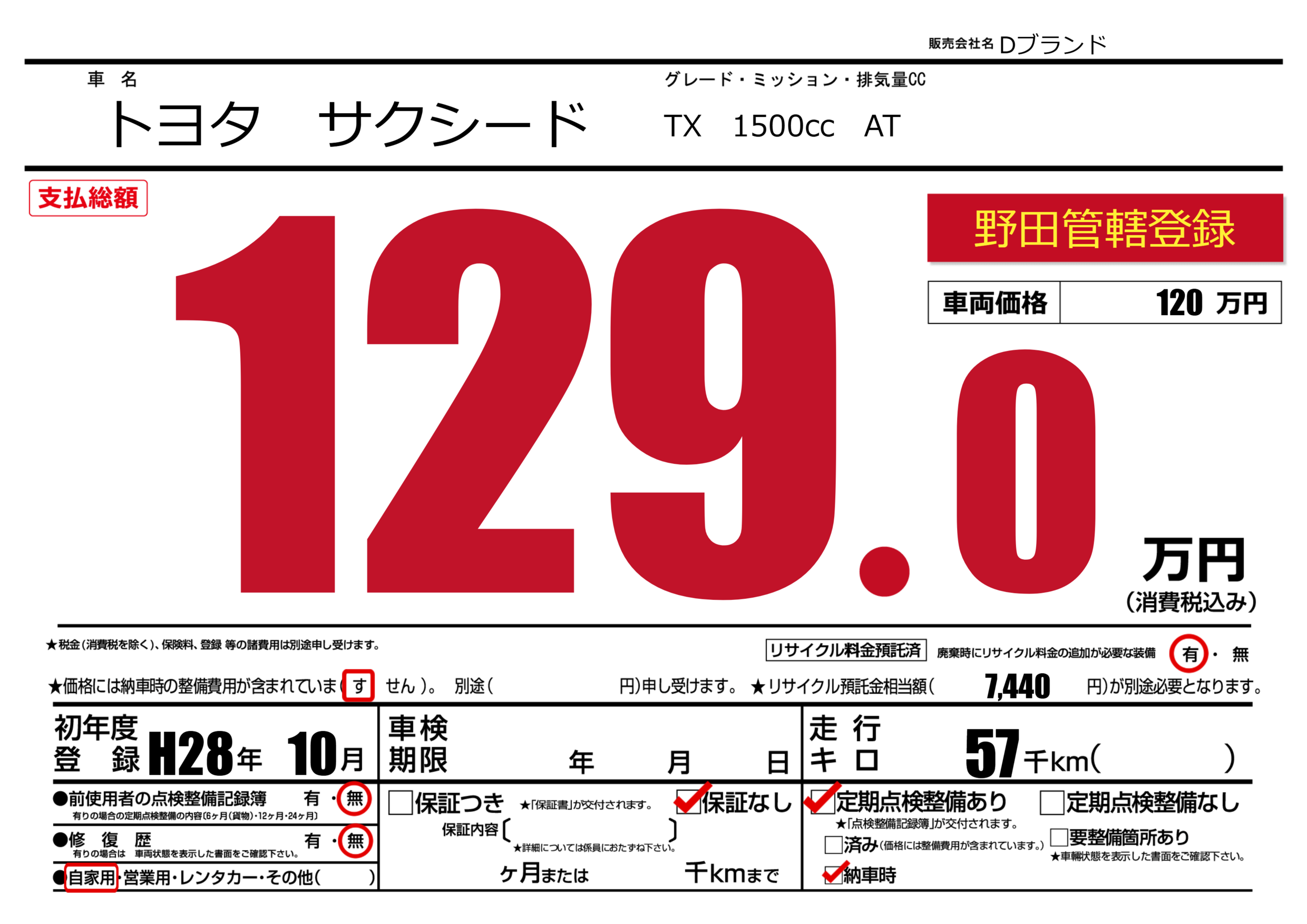 | 車名 | トヨタ サクシード | グレード ミッション 排気量 |