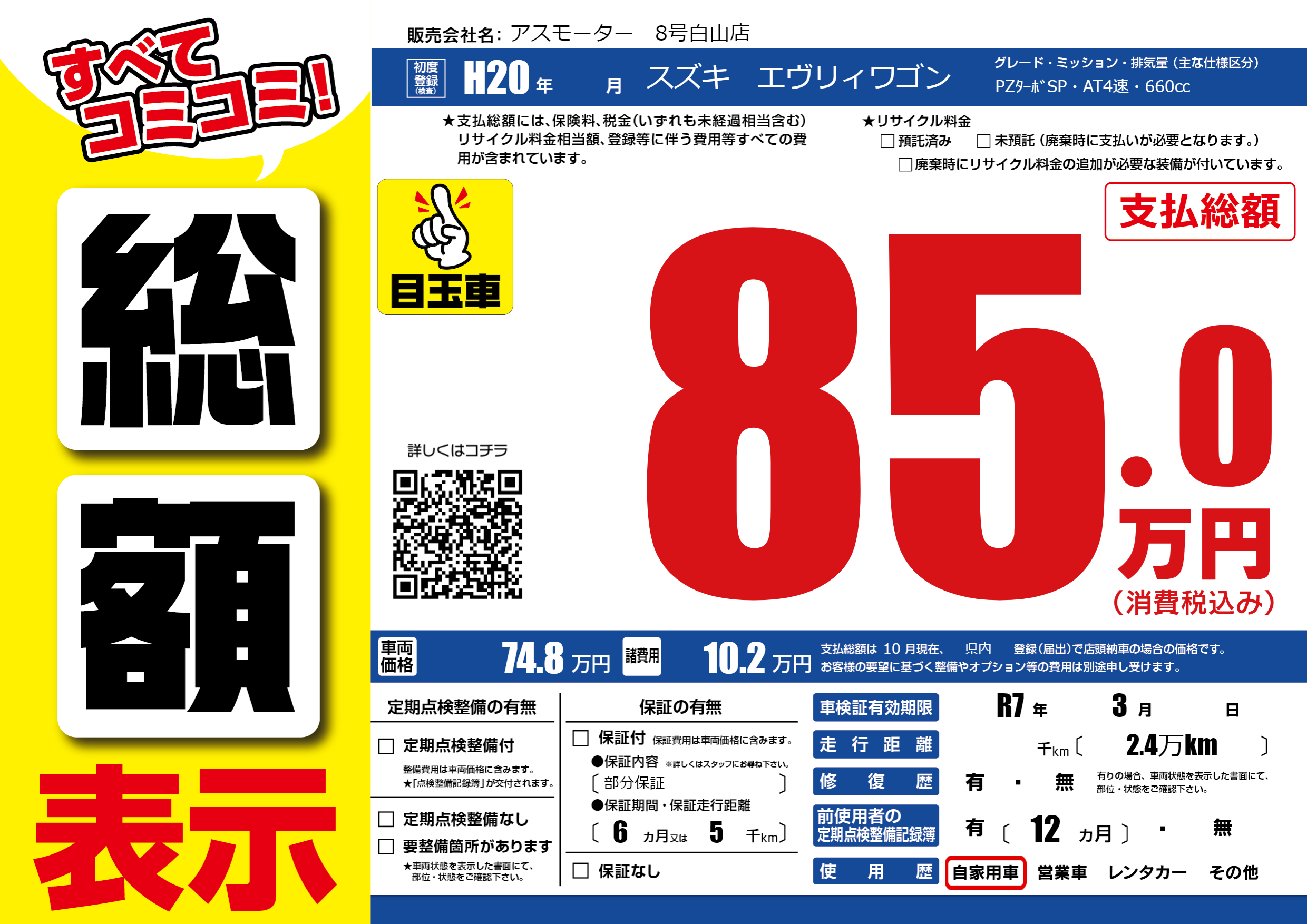 | 車名 | スズキ エヴリィワゴン | グレード ミッション 排気量 |