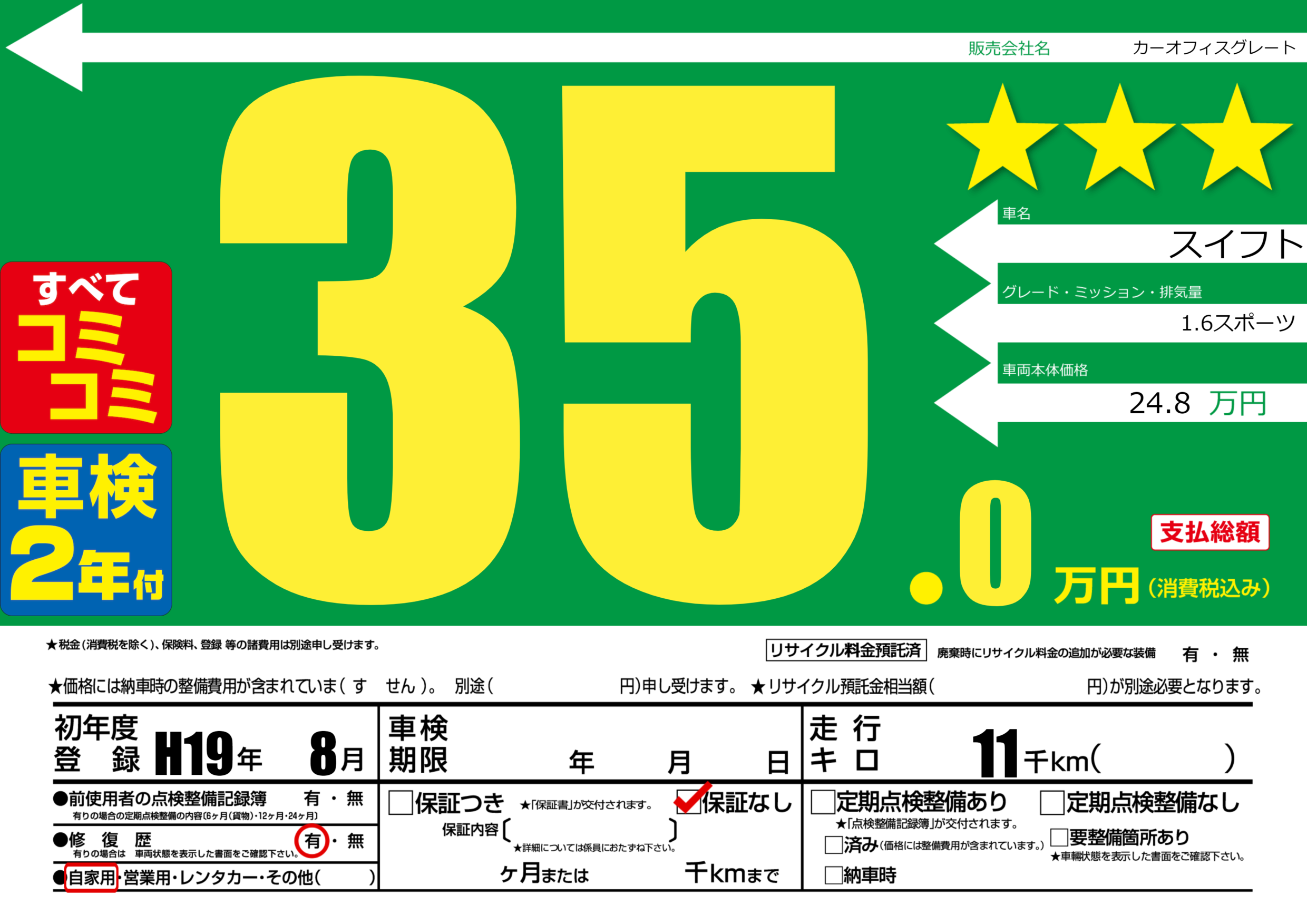 | 車名 | スイフト | グレード ミッション 排気量 |