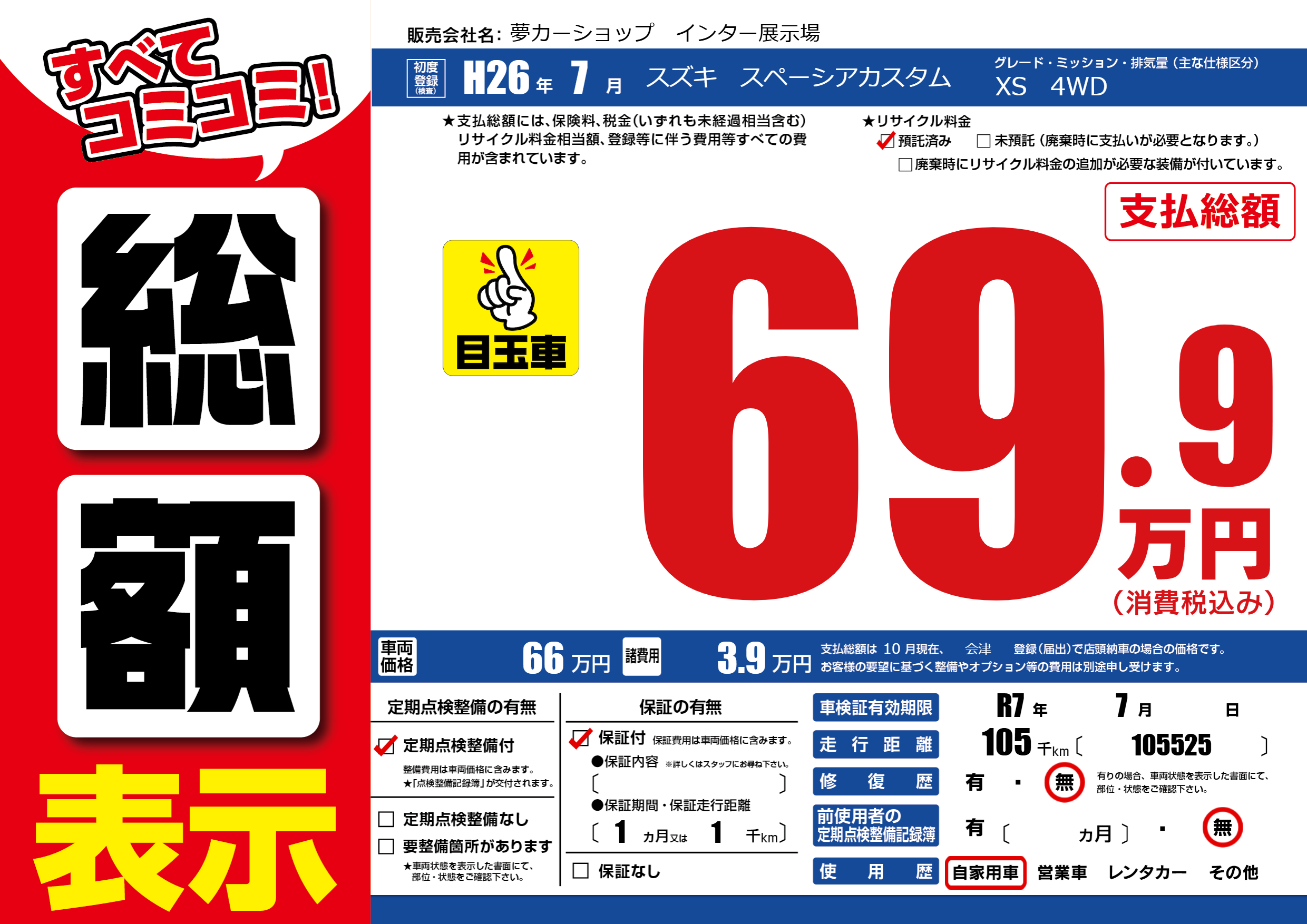 | 車名 | スズキ スペーシアカスタム | グレード ミッション 排気量 |