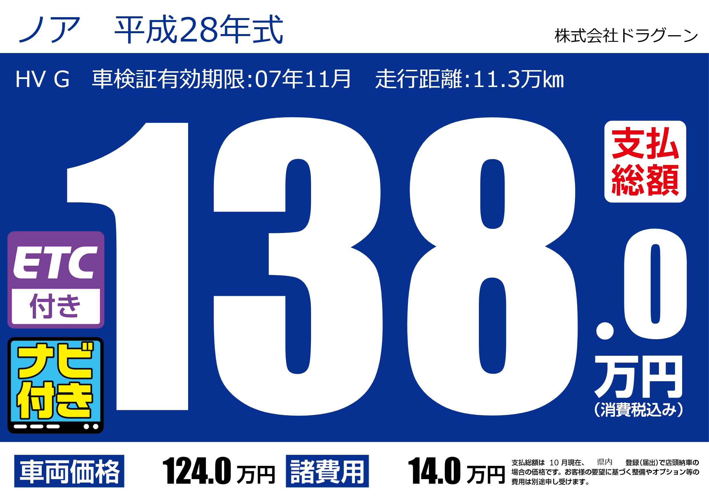 | 車名 | ノア 平成28年式 | グレード ミッション 排気量 |