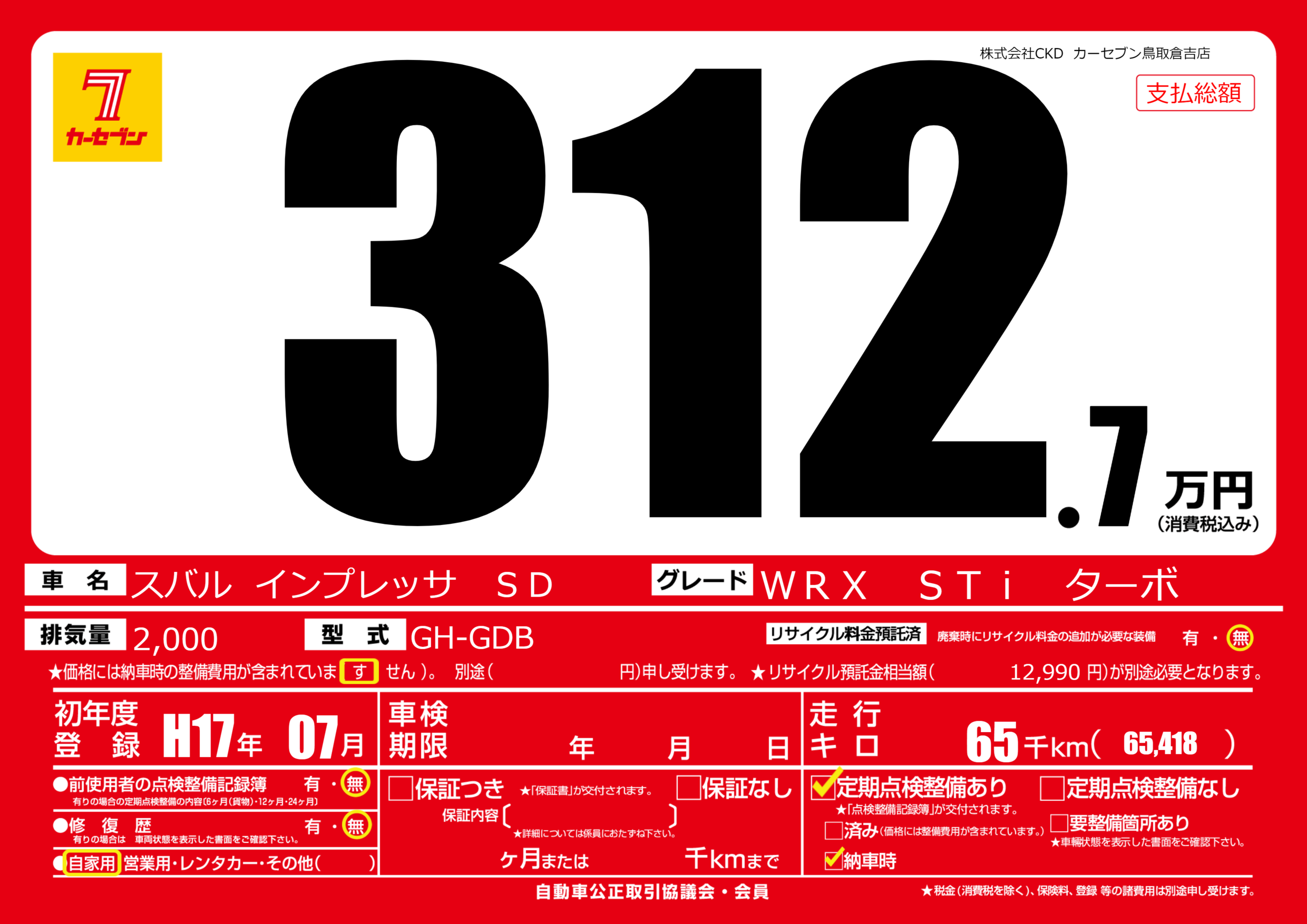 | 走行キロ | 6.5万km | 初年度登録 | H17年07月 |