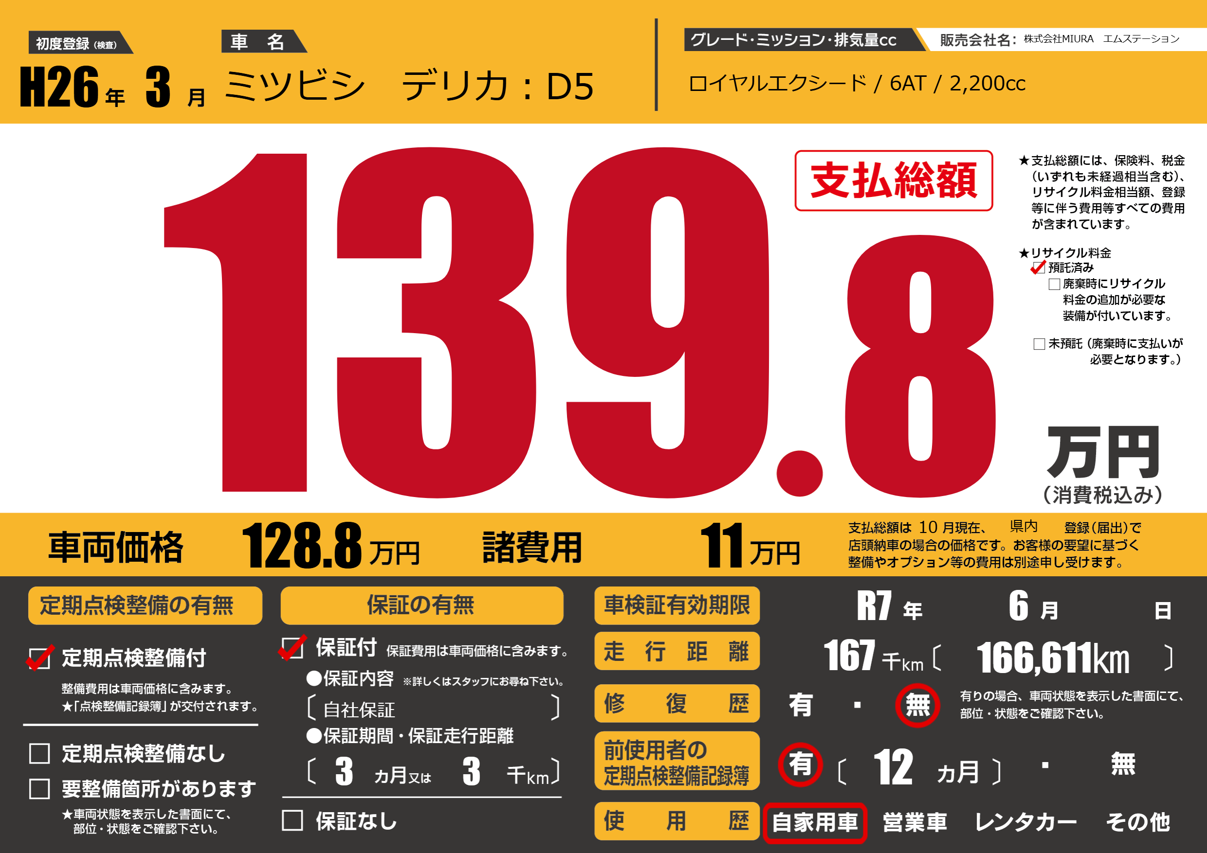 | 車名 | ミツビシ デリカ:D5 | グレード ミッション 排気量 |