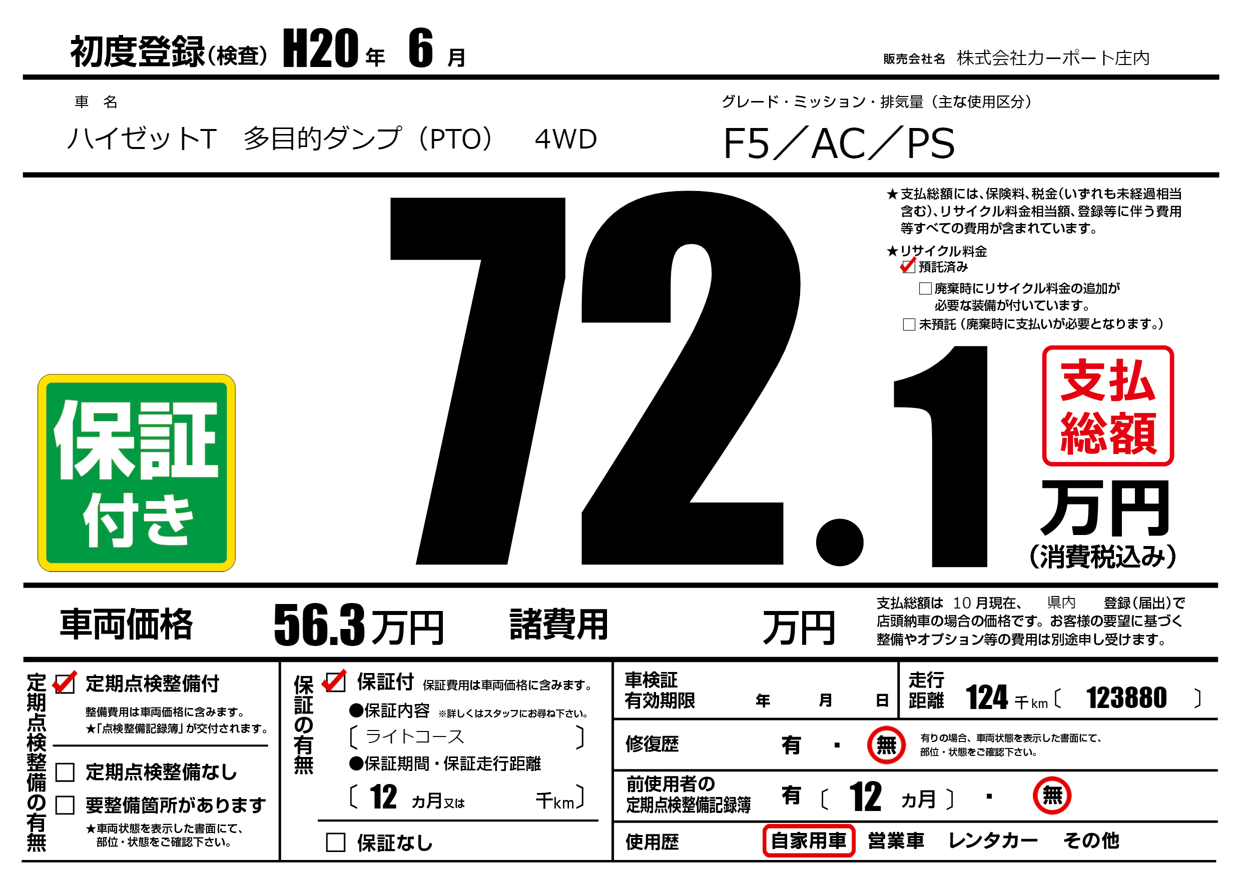 | 走行キロ | 12.4万km | 初年度登録 | H20年6月 |