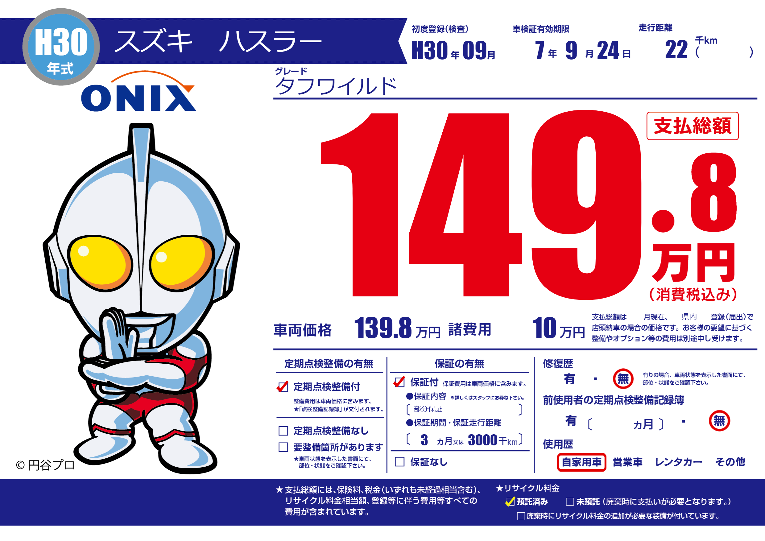 | 走行キロ | 2.2万km | 初年度登録 | H30年09月 |