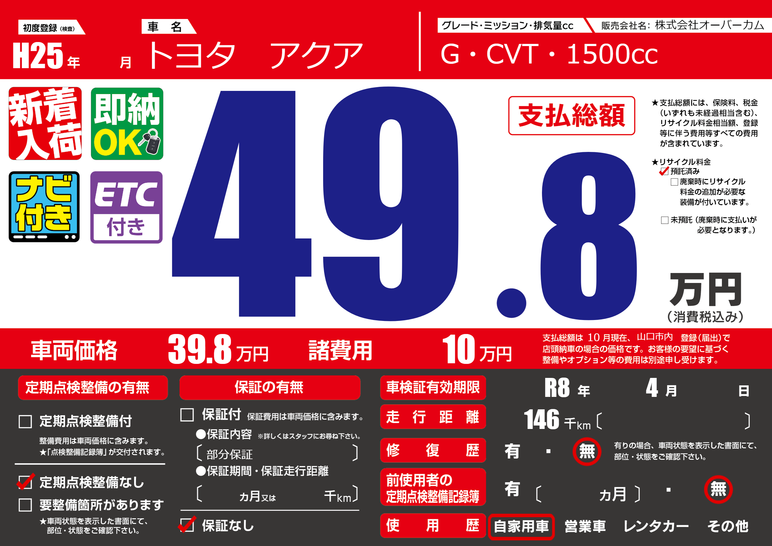 | 走行キロ | 14.6万km | 初年度登録 | H25年---月 |