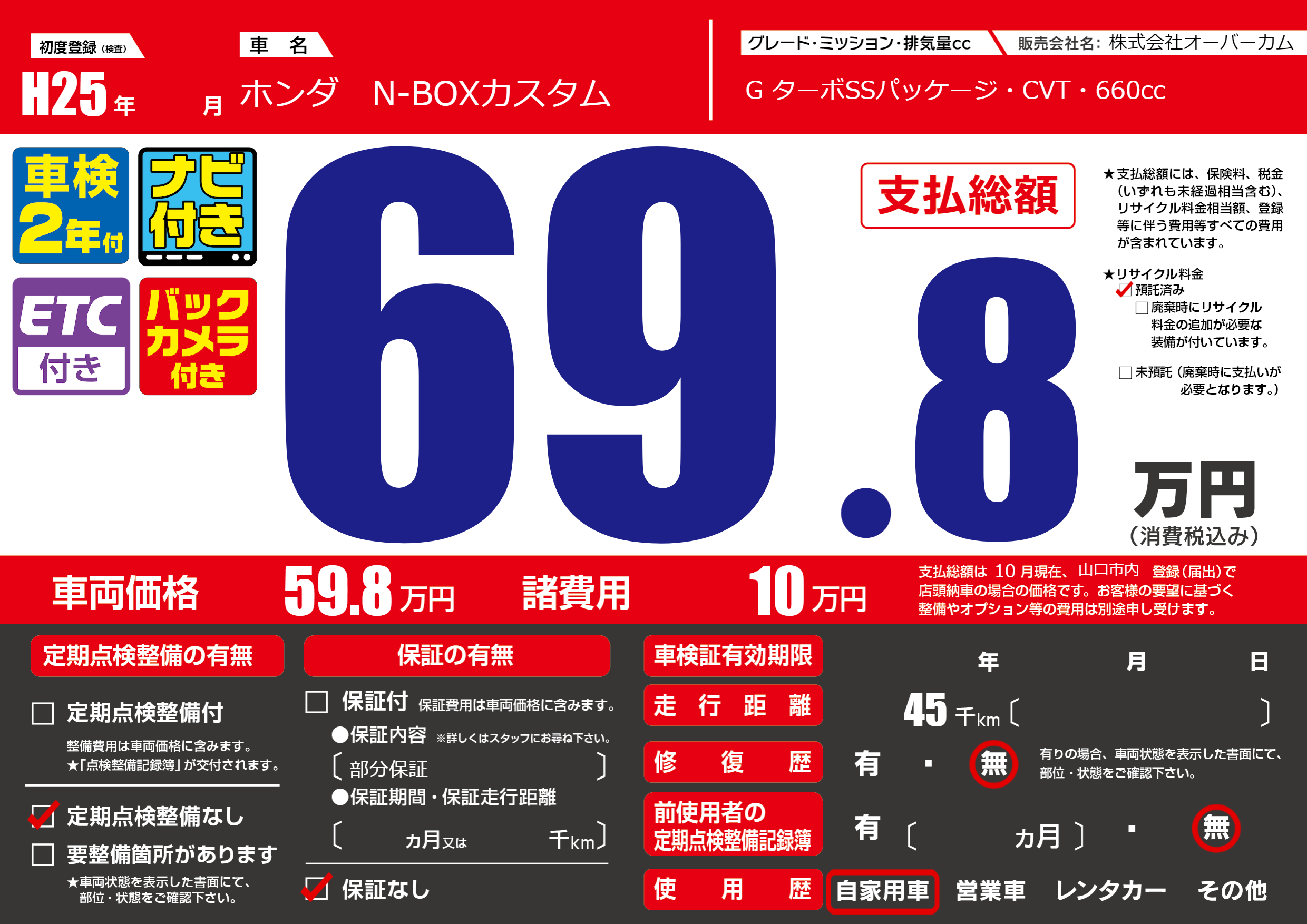 | 車名 | ホンダ N-BOXカスタム | グレード ミッション 排気量 |