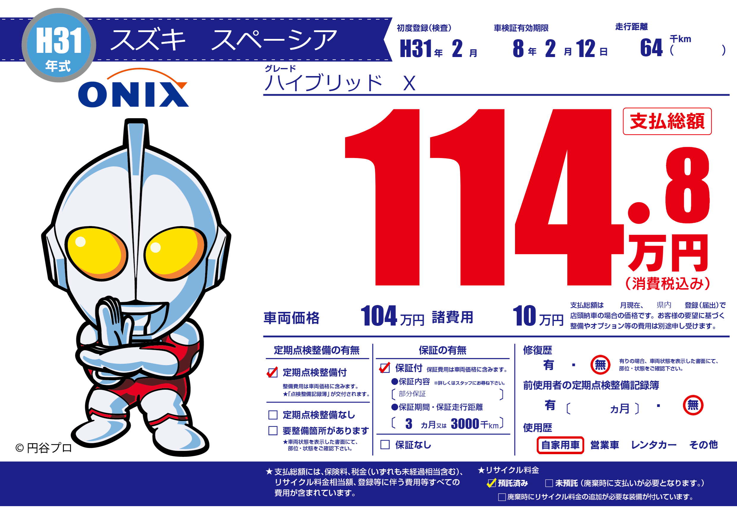 | 車名 | スズキ スペーシア | グレード ミッション 排気量 |