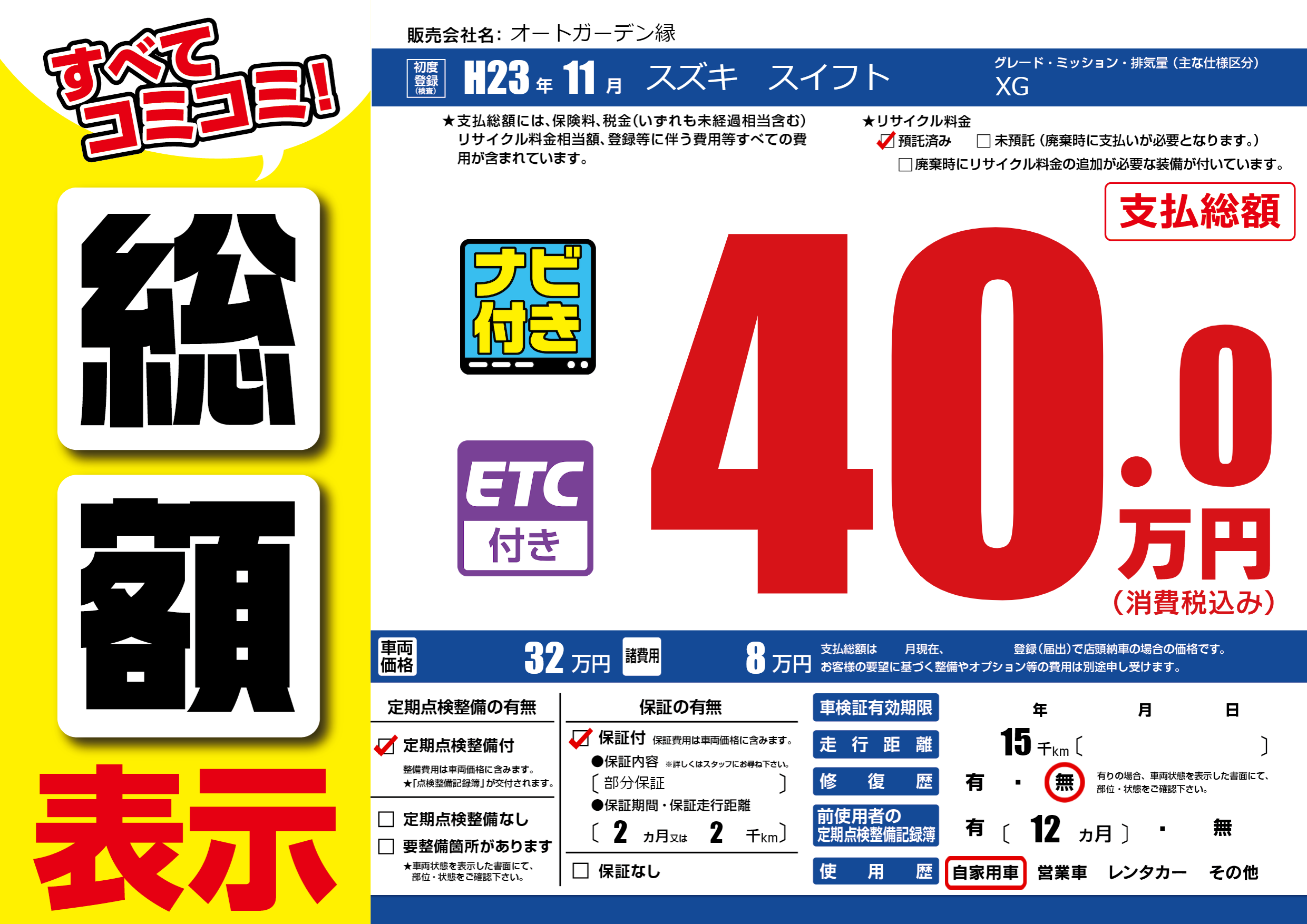 | 車名 | スズキ スイフト | グレード ミッション 排気量 |