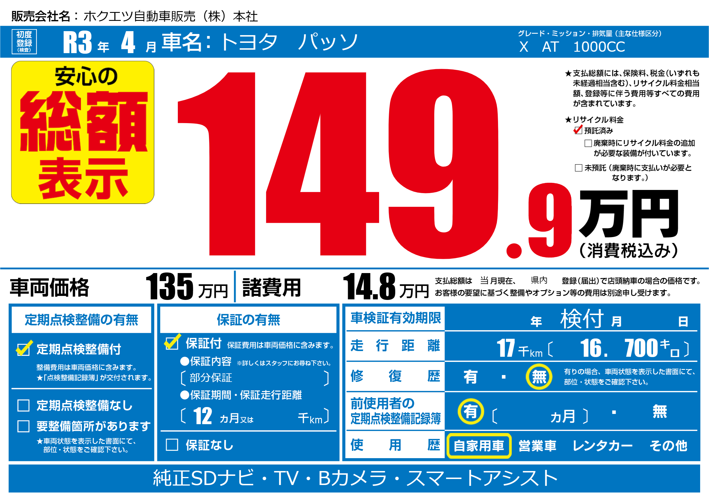 あり | リサイクル預託金相当額 | ( 0円)が別途必要 |